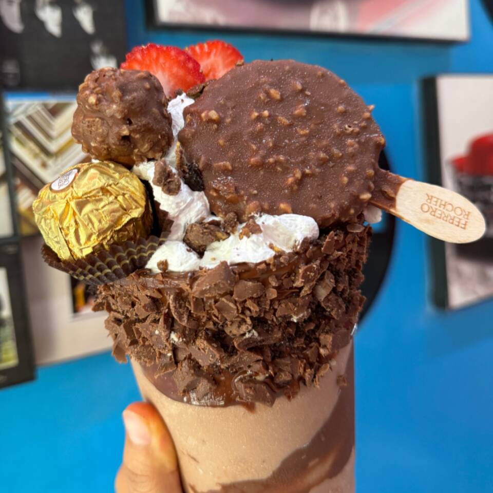 Frappe a base de chocolate Ferrero, acompañado de avellana, decorado con más Ferrero.