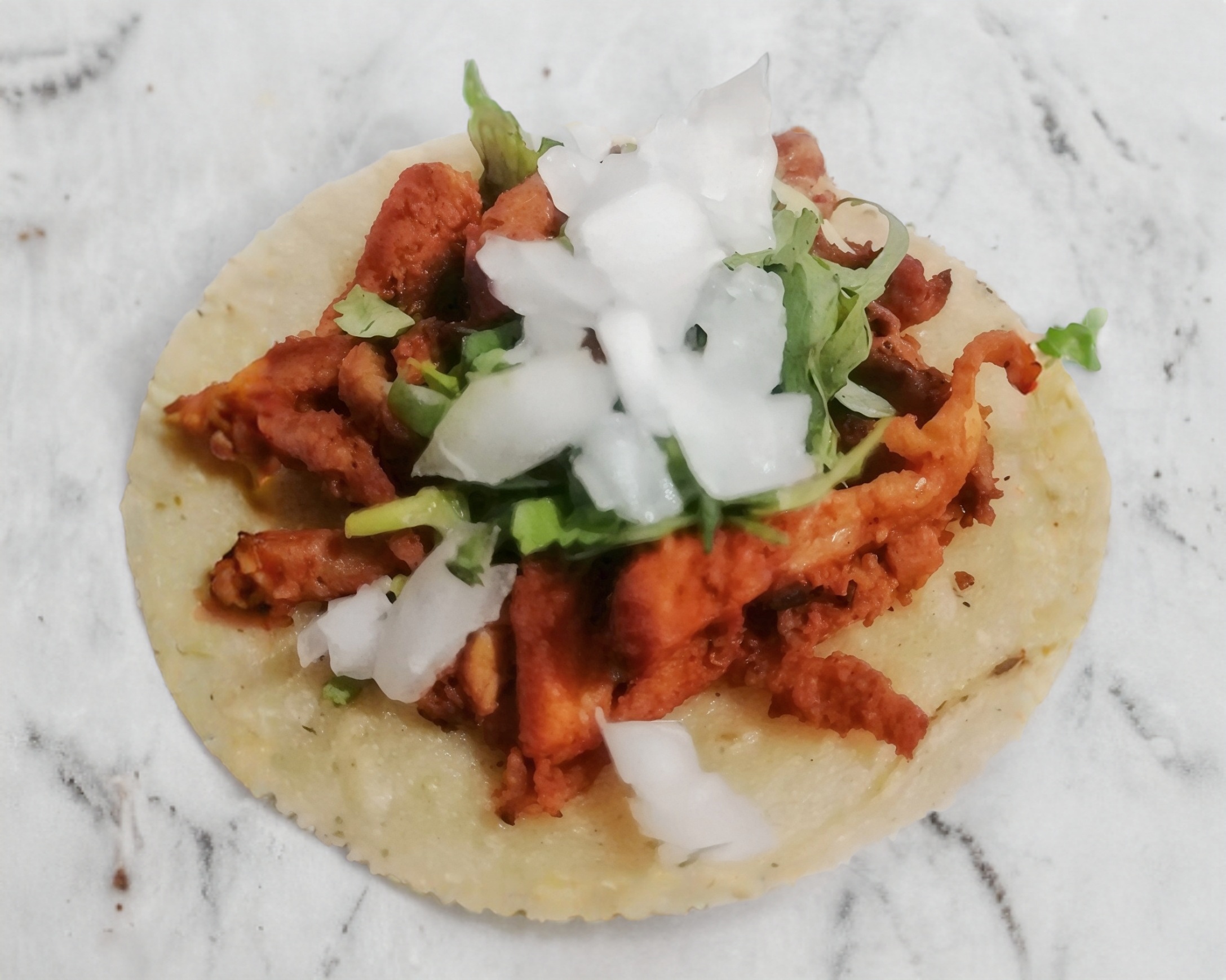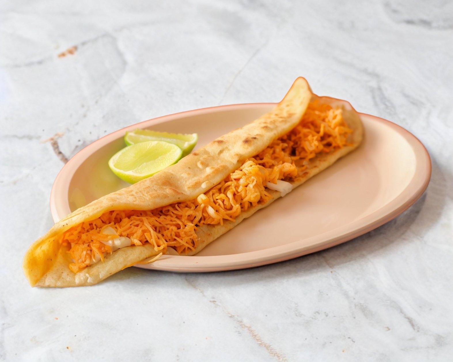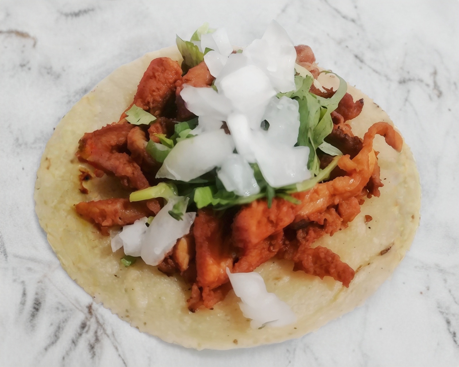 Tortilla de maíz (40 cm) recién hecha, rellena con carne de puerco al pastor y queso de hebra.