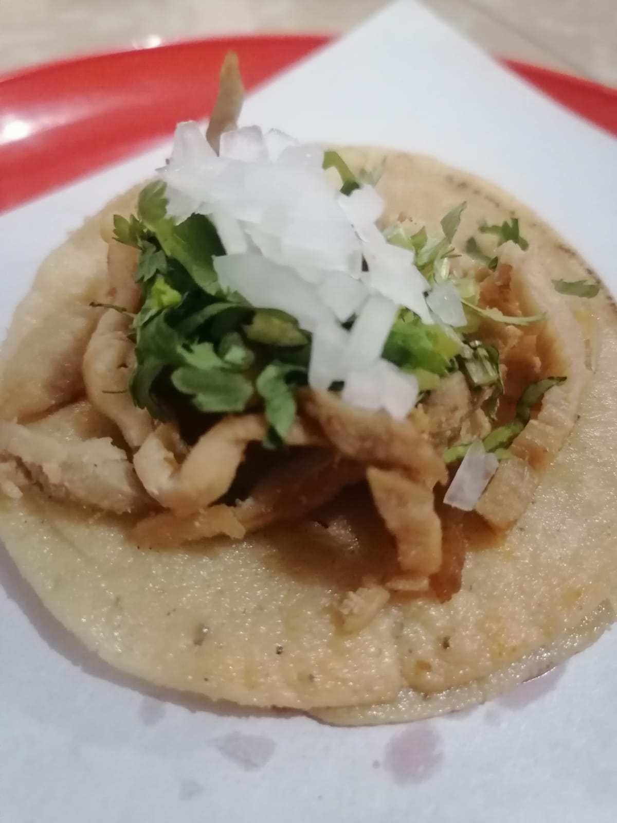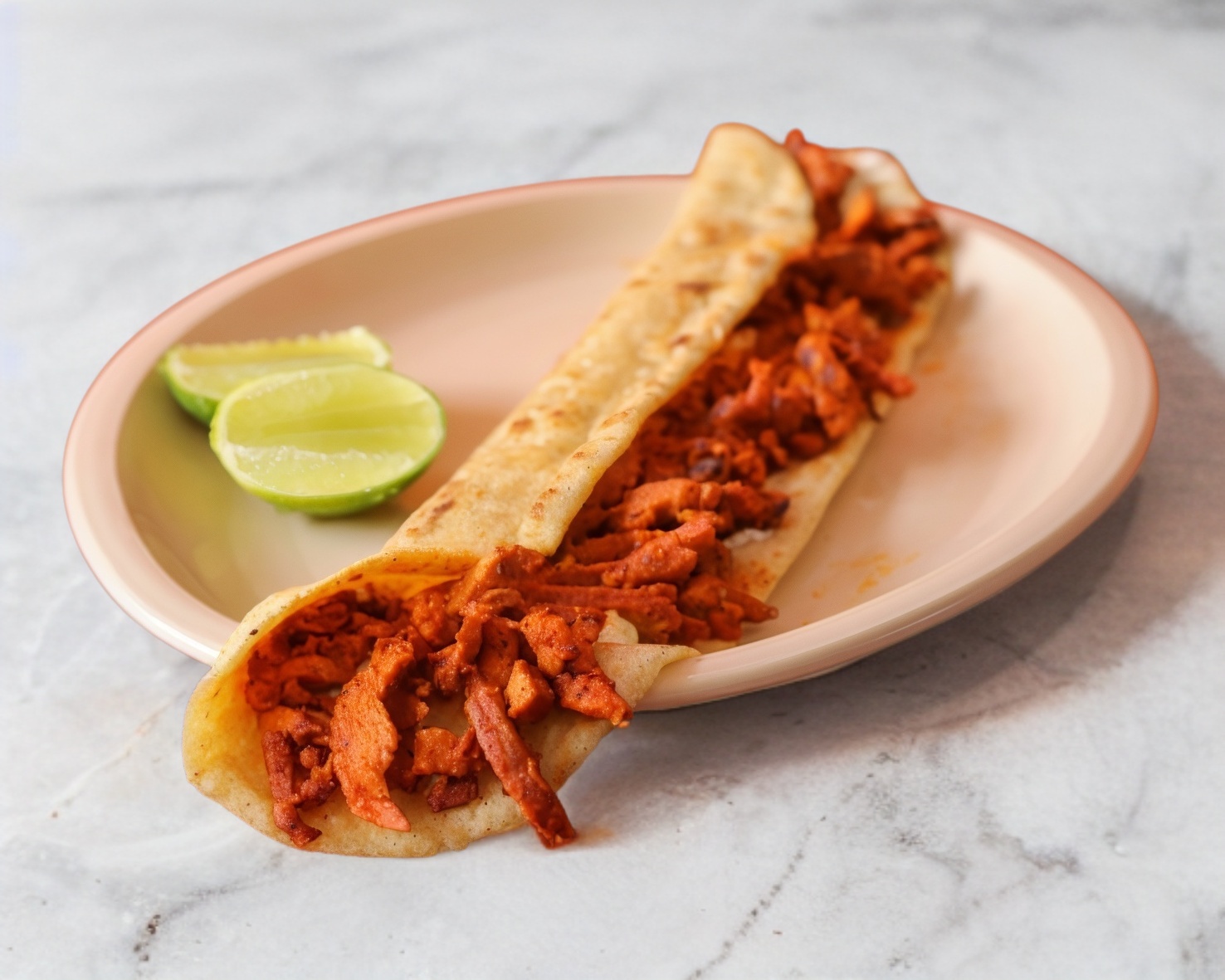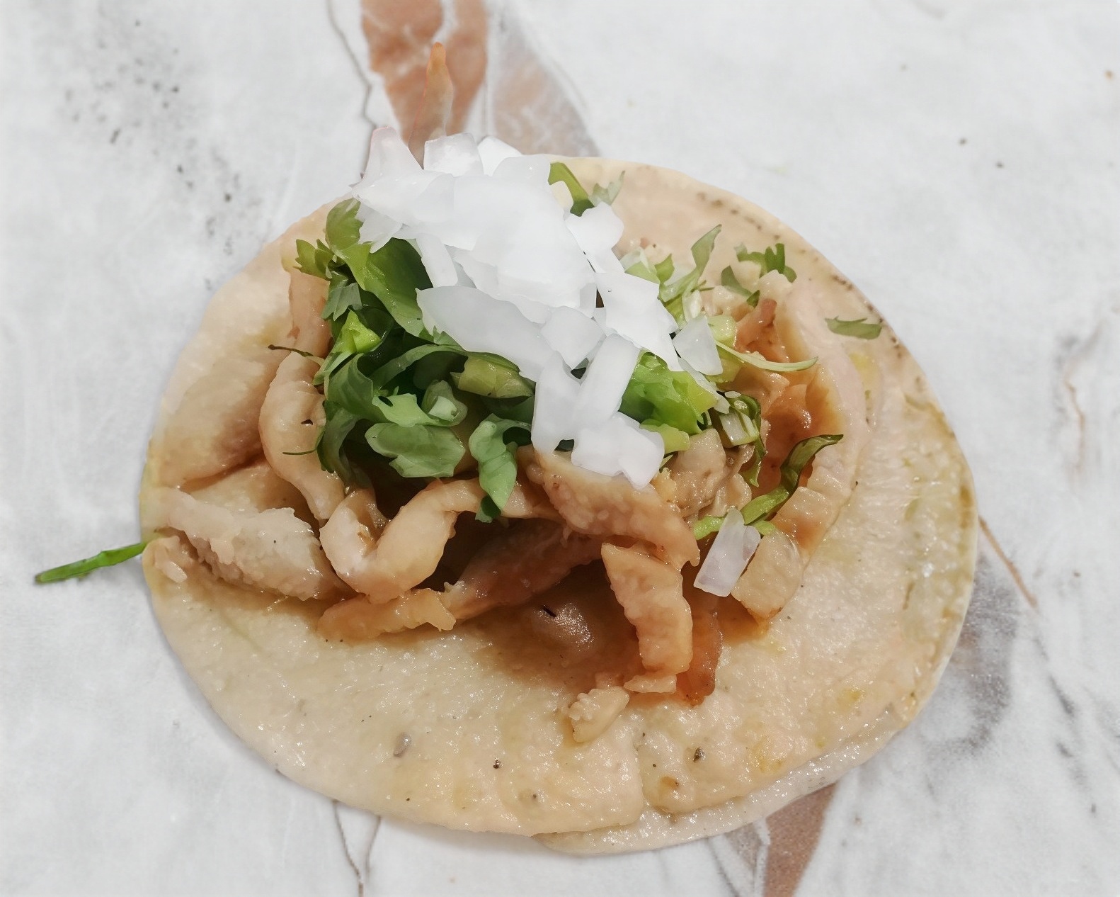 Tortilla de maíz (40 cm) recién hecha, rellena con carne de puerco al pastor y queso de hebra.
