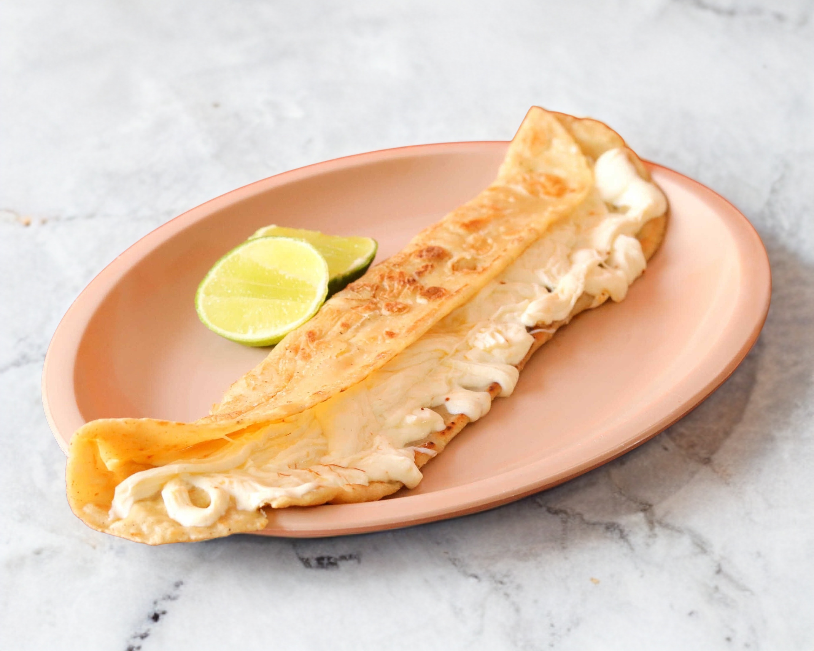Tortilla de maíz (40 cm) recién hecha, rellena con doble queso de hebra.