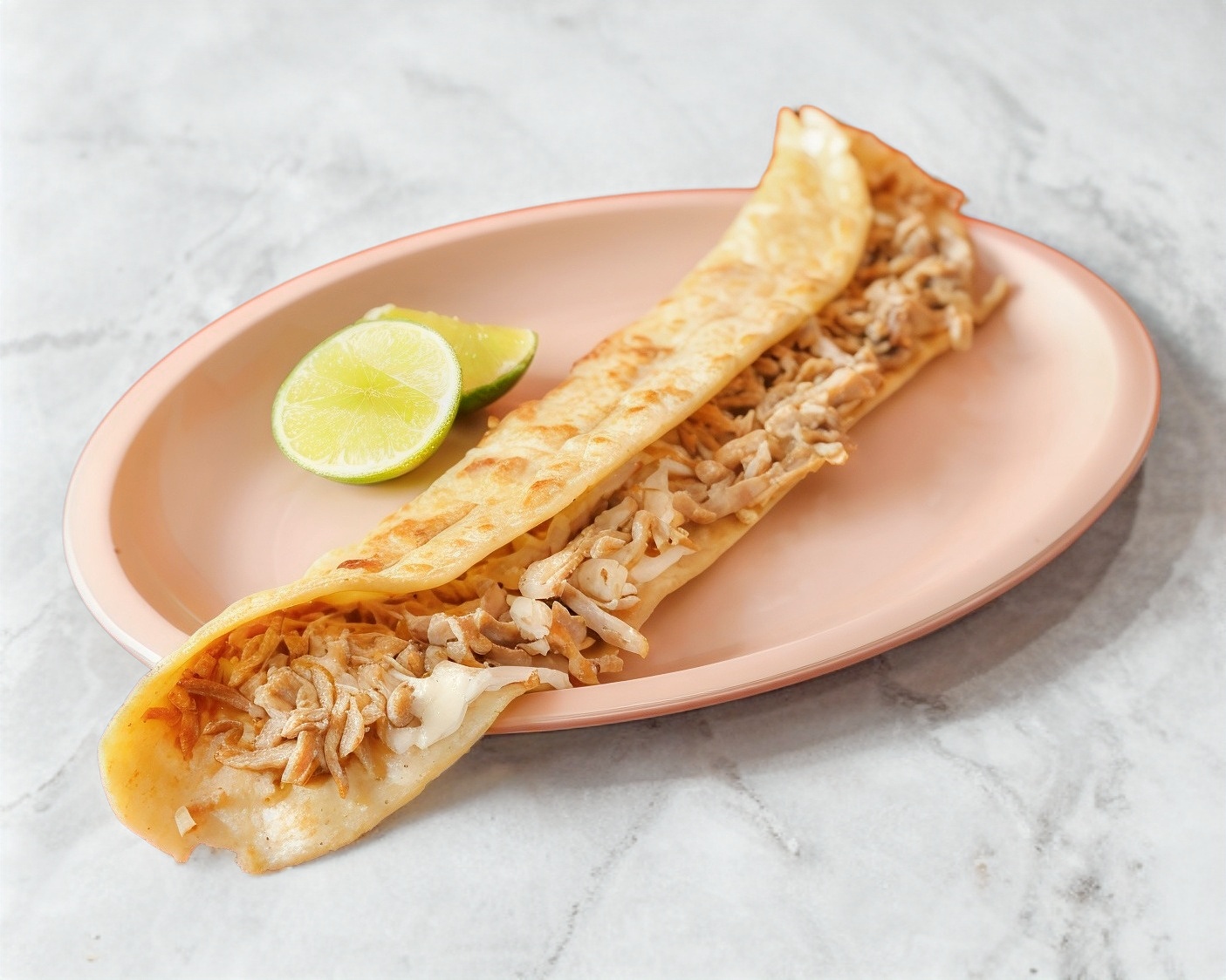 Tortilla de maíz (40 cm) recién hecha, rellena con carne de pollo deshebrado y queso de hebra.