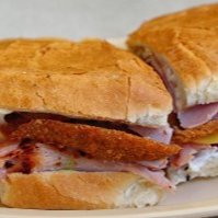 Sandwich relleno de pollo, tocino, jamón, queso amarillo, lechuga, jitomate y cebolla. Acompañado de papas a la francesa