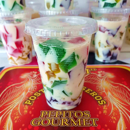 Elaboradas con base de gelatina de agua 4 sabores diferentes (Fresa, Piña, Limon y Uva), Grenetina, Leche Carnation y Leche Condensada, Media Crema y Rompope como complemento