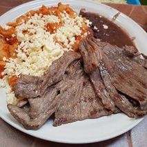 Estrujada acompañada con bistec de cerdo o huevo al gusto, elige tu salsa favorita, queso y frijoles