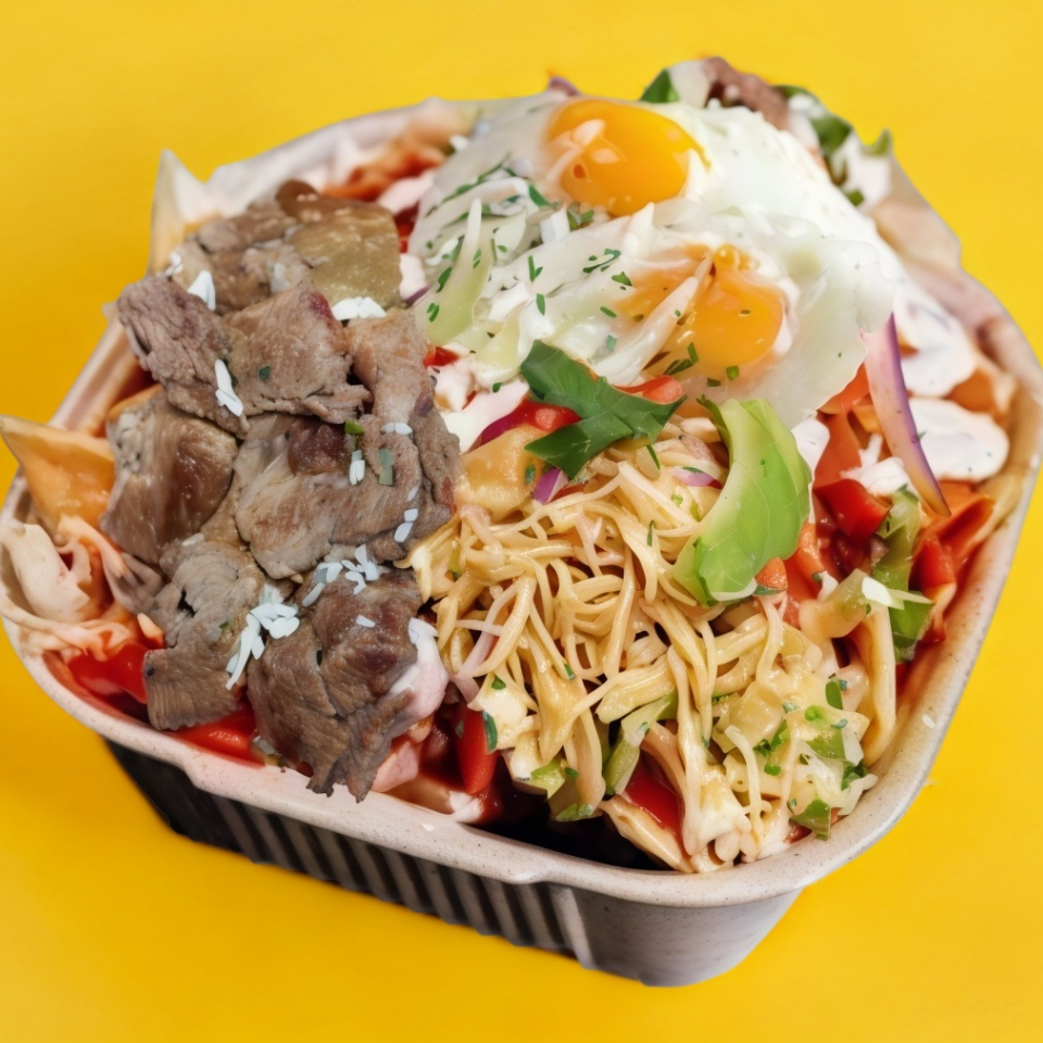Chilaquiles con salsa a tu elección, Incluye Longaniza, Huevo, Bistec, Pollo , cebolla, queso, crema, sin aguacate.