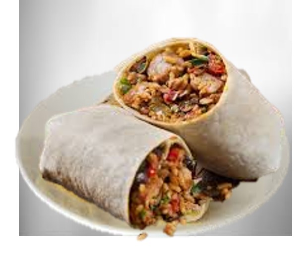 Tortilla de Harina, queso, arroz, frijoles, bistec, aguacate, cebolla y lechuga.