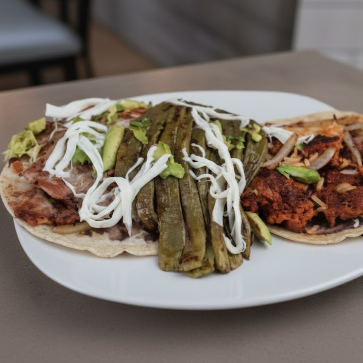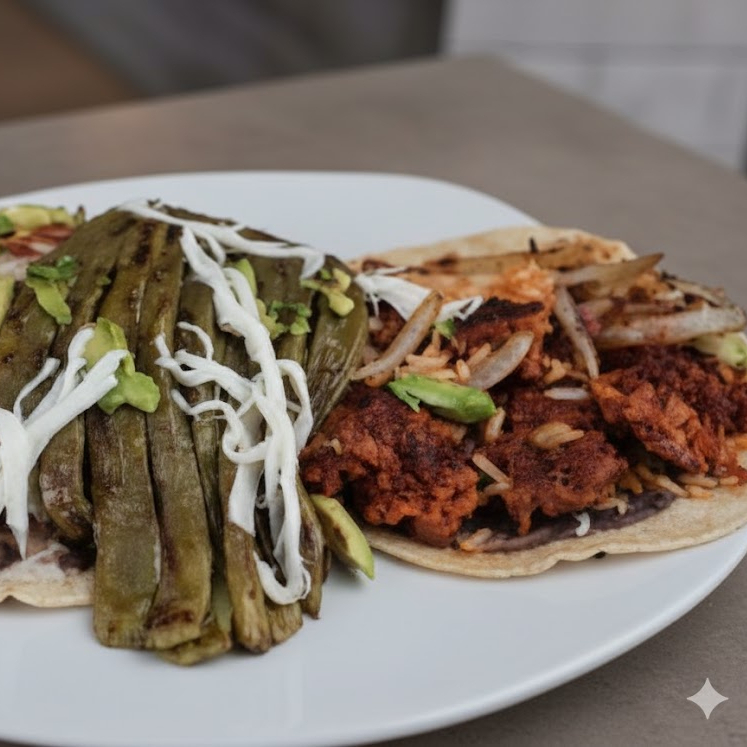Tortilla echa a mano, frijoles, arroz, Nopales, cebolla, papas, picante a elegir y puedes escojer uno o varios acompañantes.