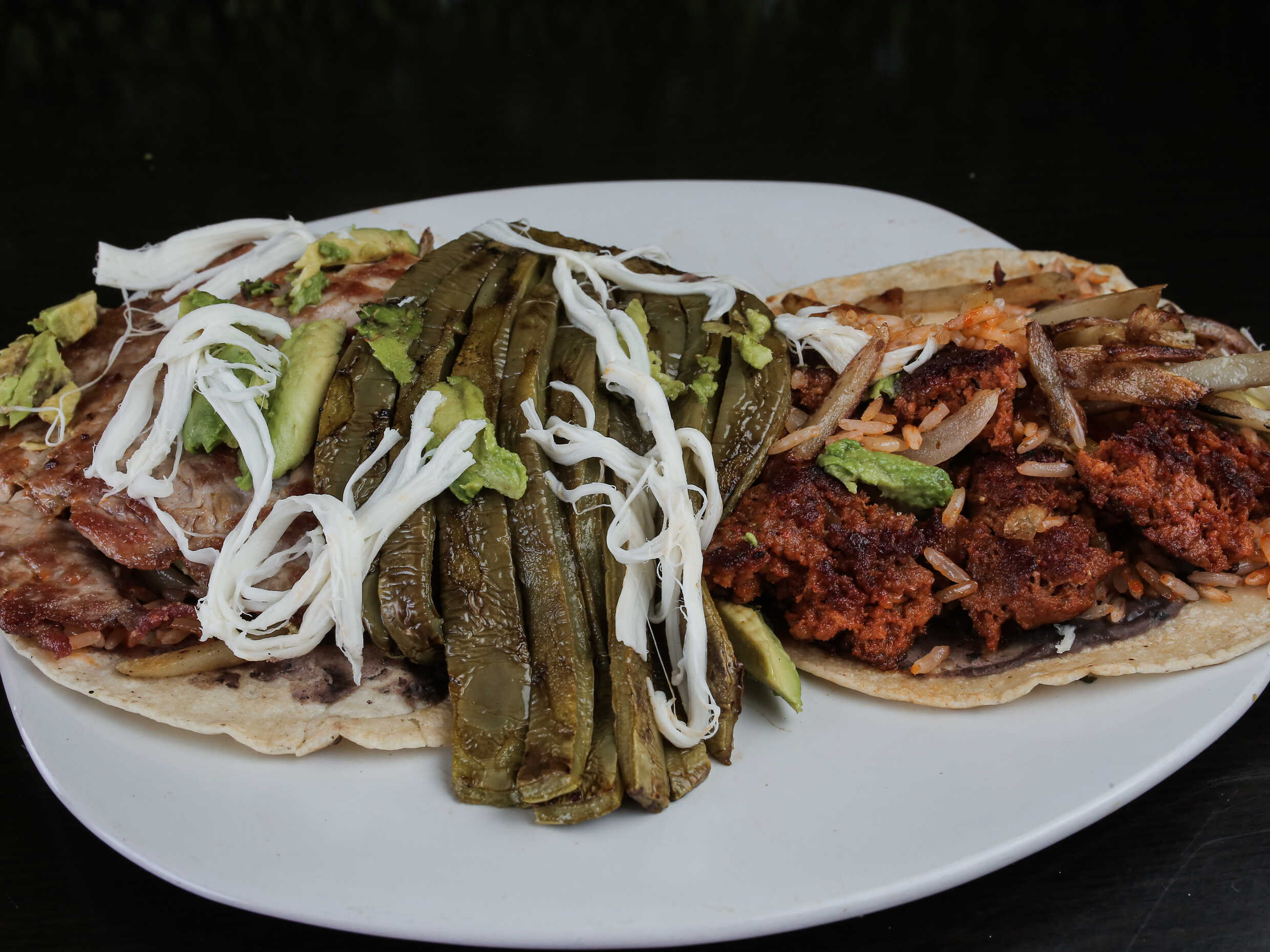 Doble tortilla echa a mano, longaniza, papas fritas, arroz, frijol, nopal, aguacate, rajas o salsa, longaniza.