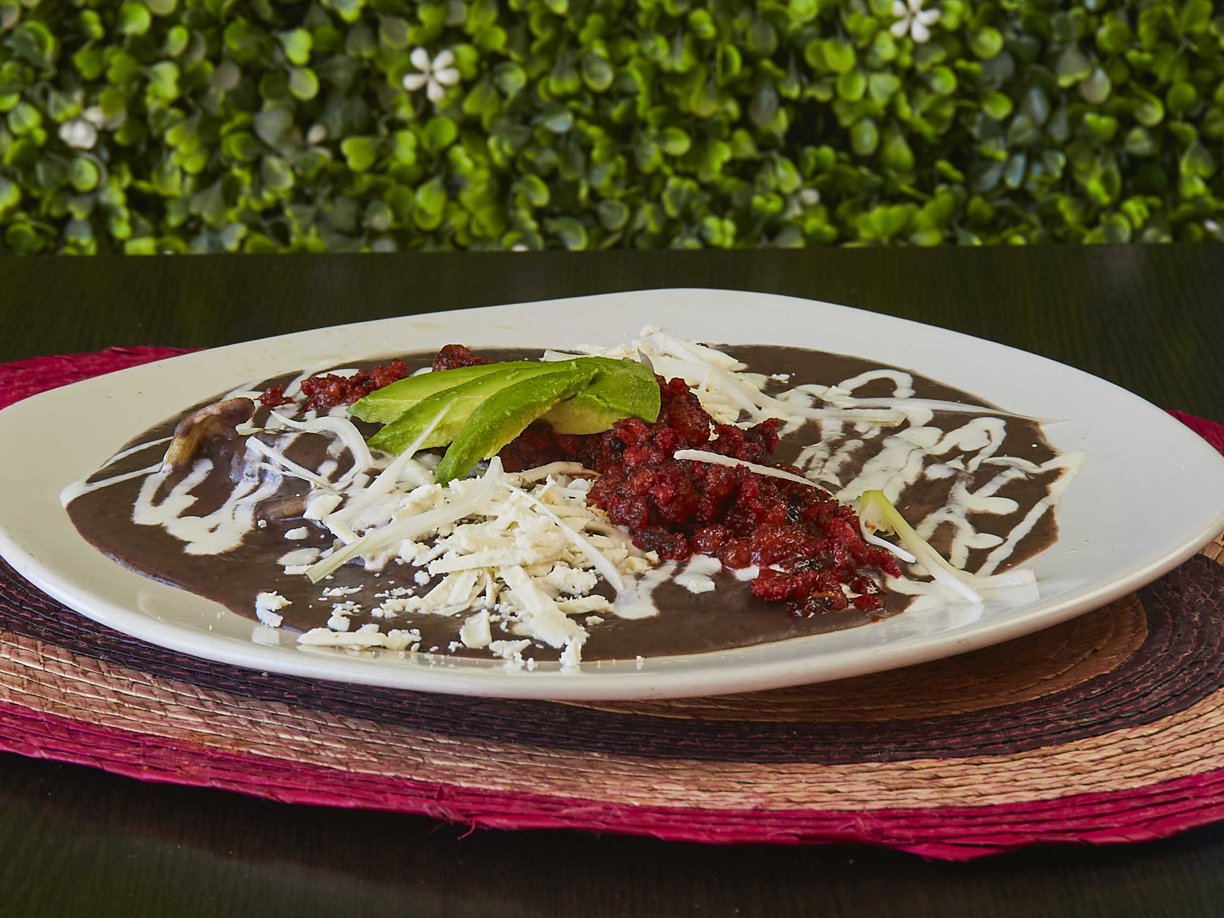 3 Piezas rellenas de pollo, Crema, Cebolla, Aguacate, Queso y Frijoles