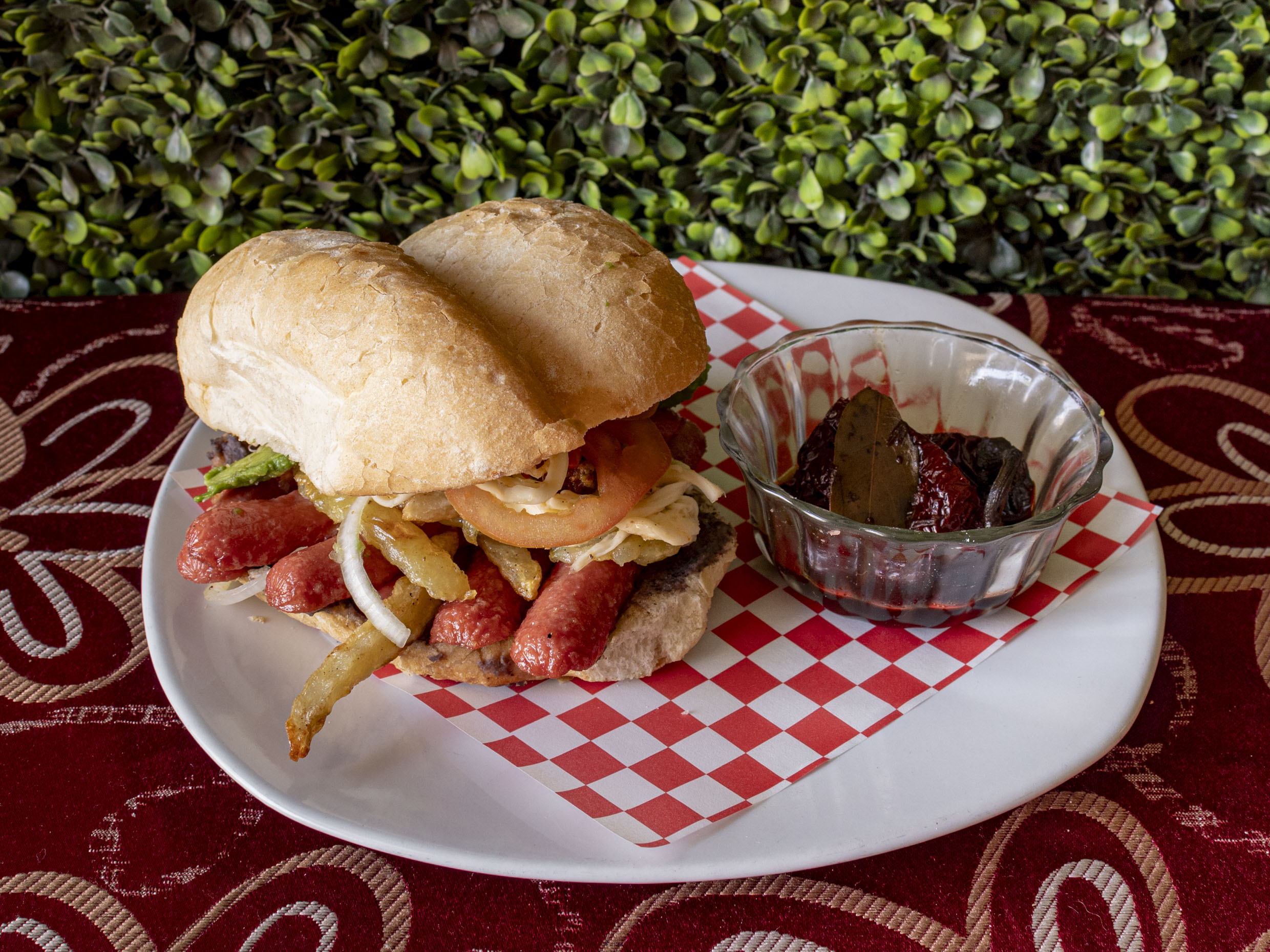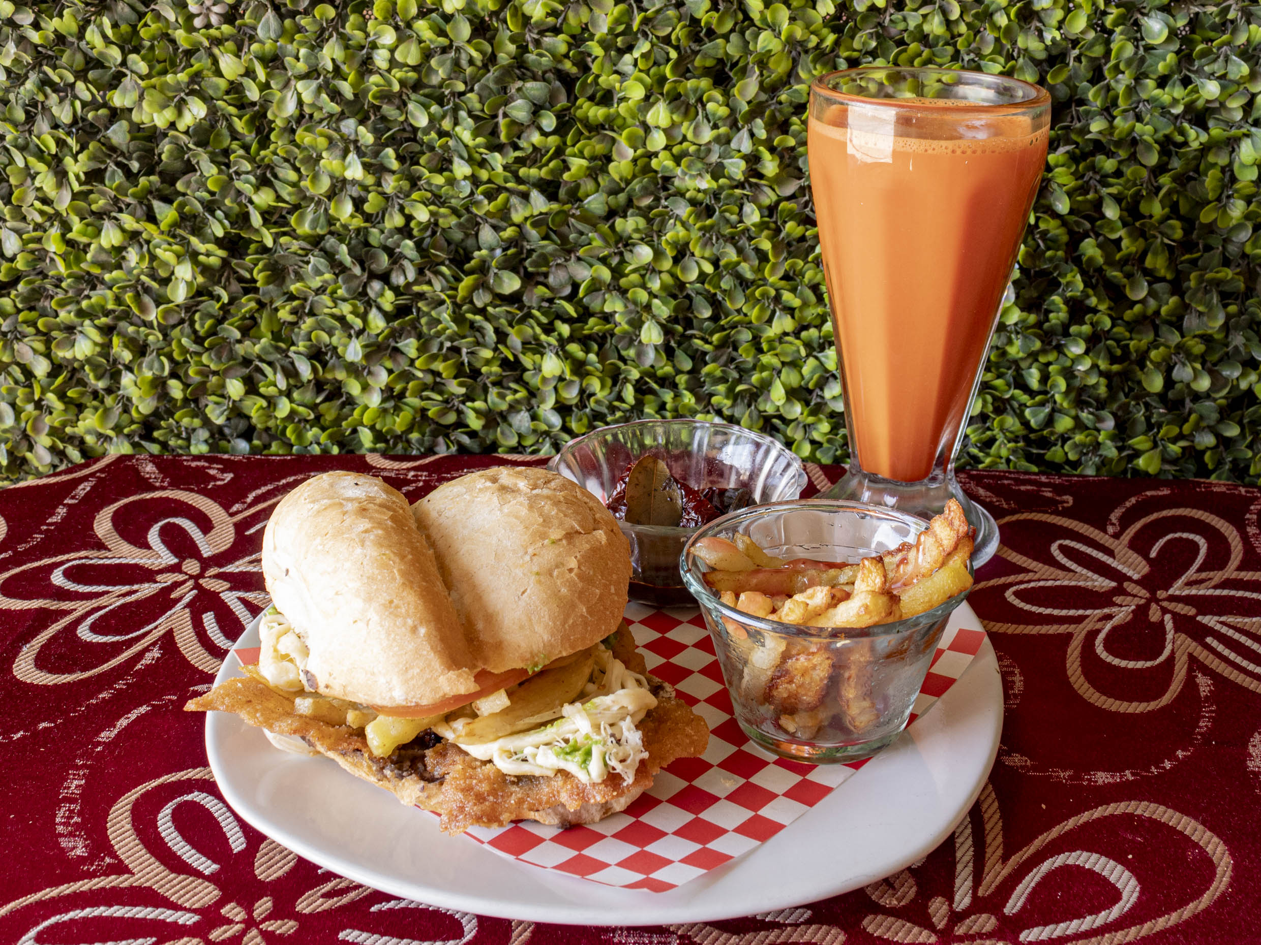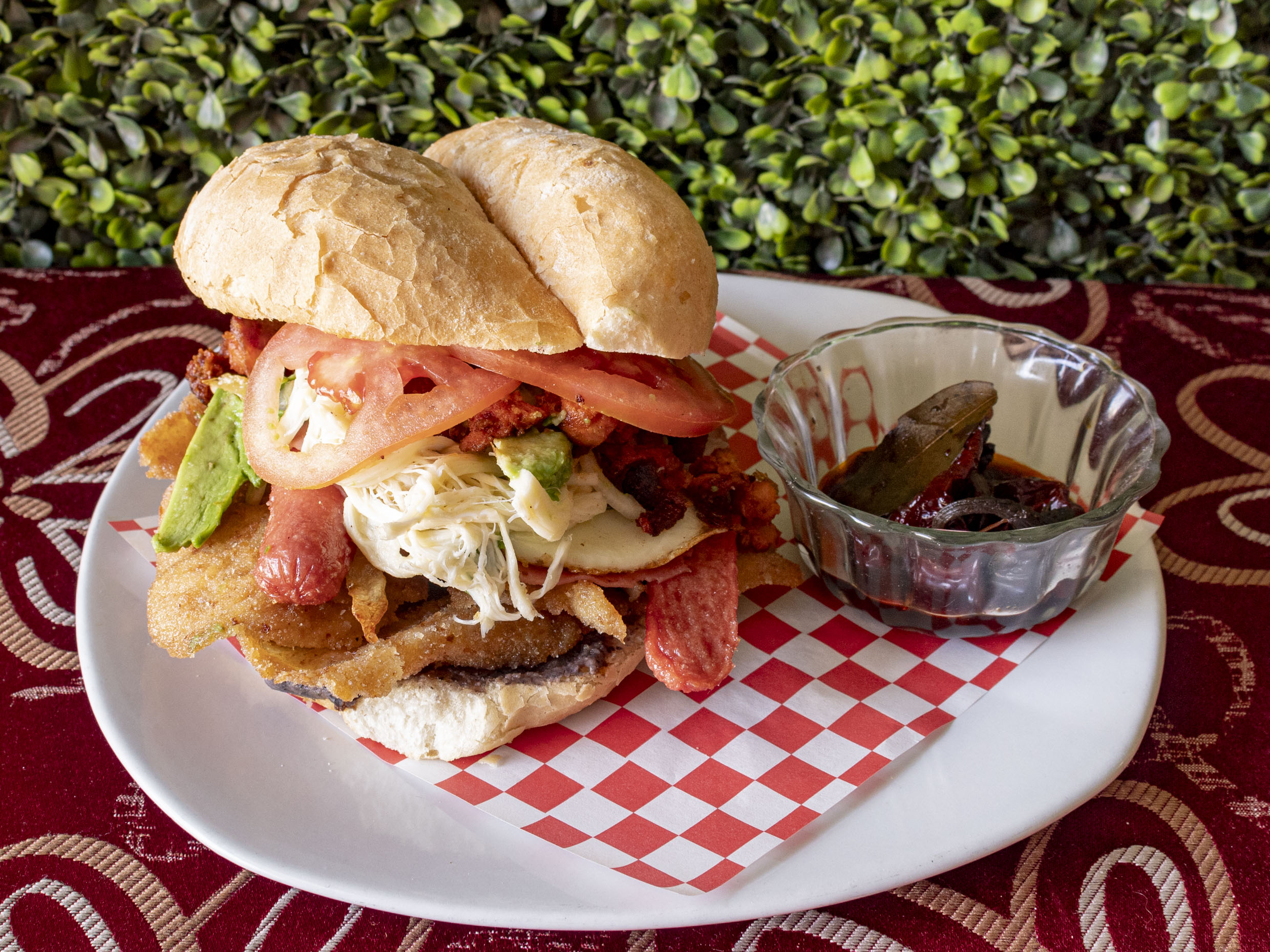 Pan Blanco, Bistec, jamón, pollo, huevo, queso, lechuga, jitomate, cebolla, mayonesa y AGUA DE FRUTA NATURAL.