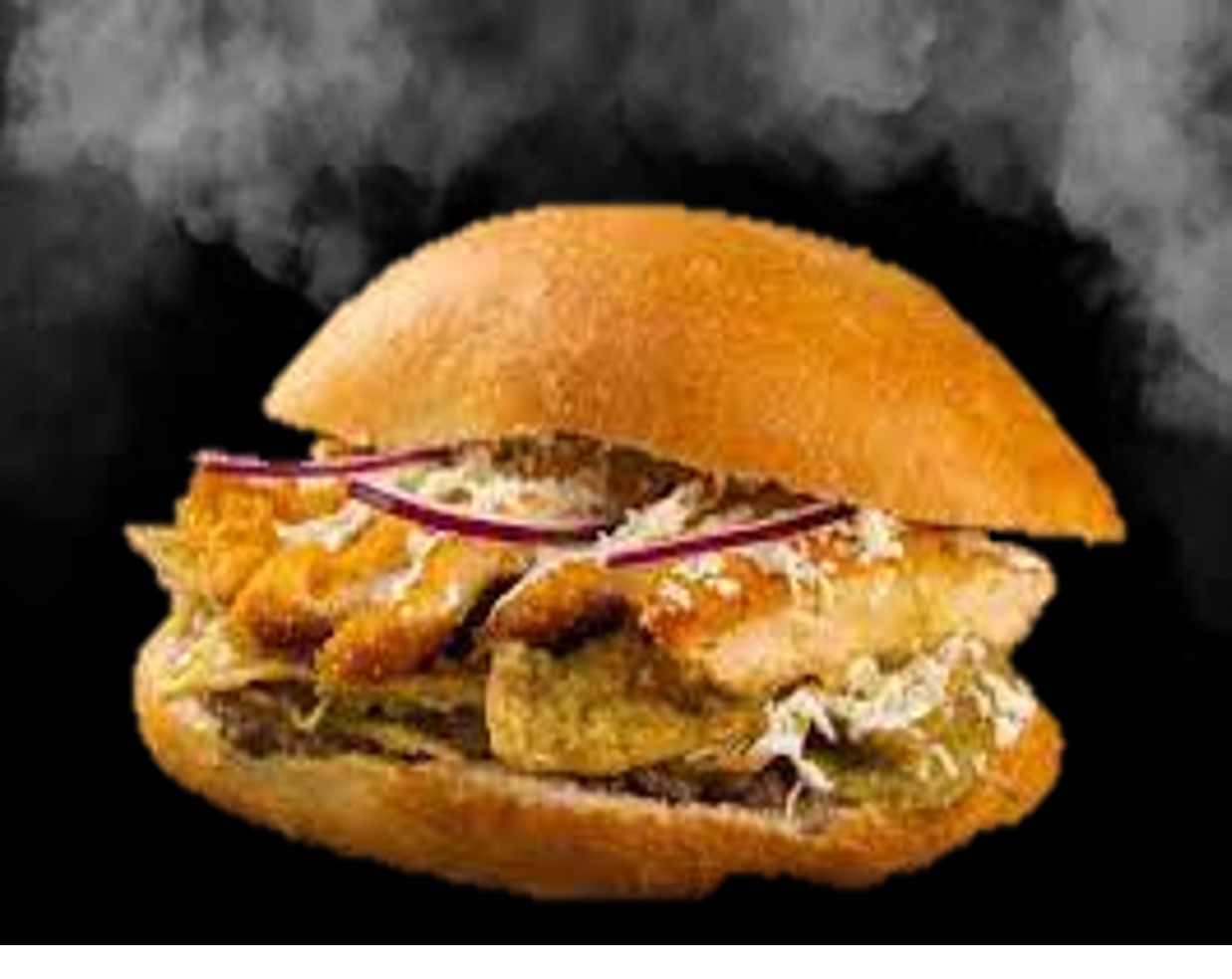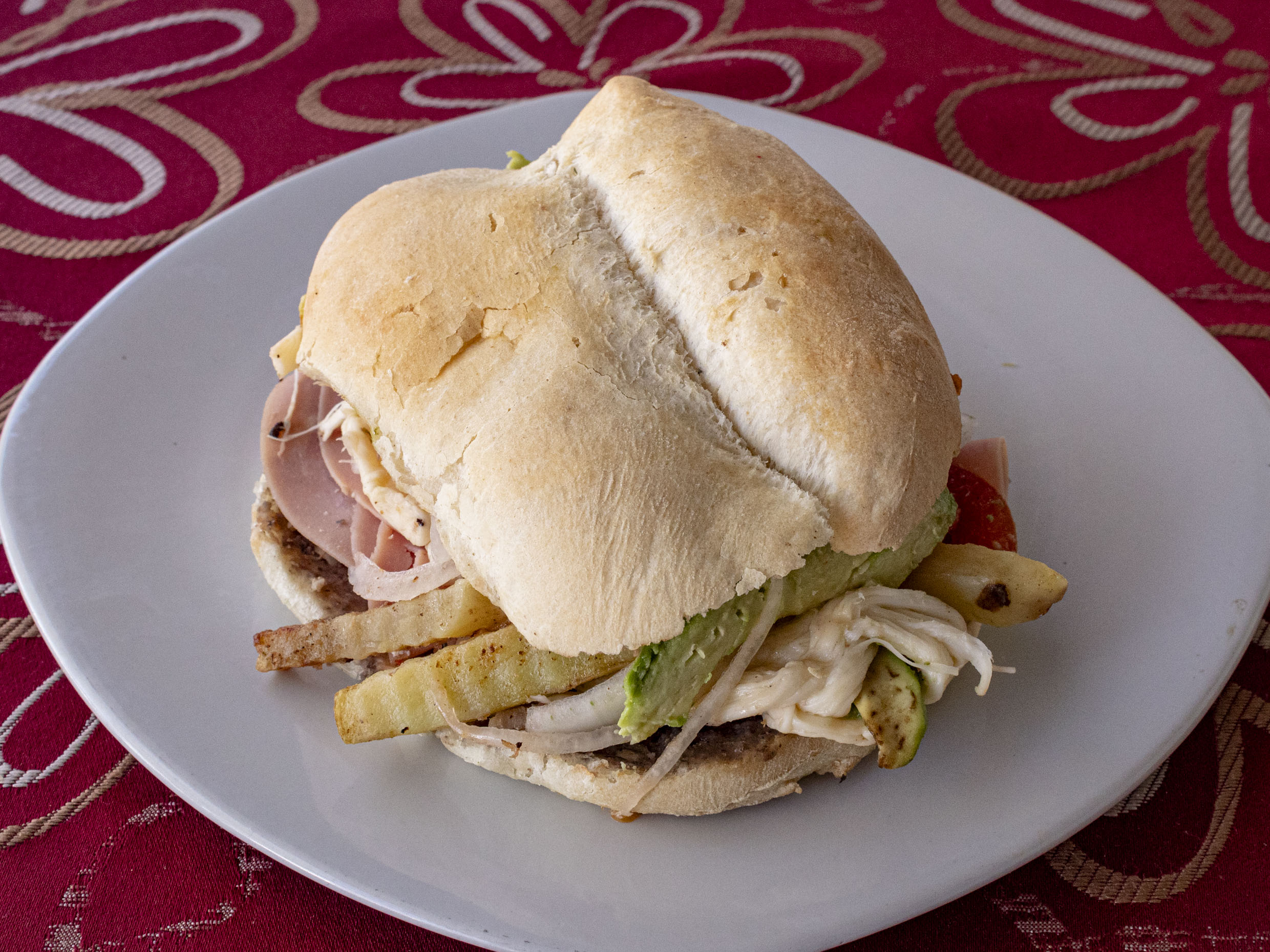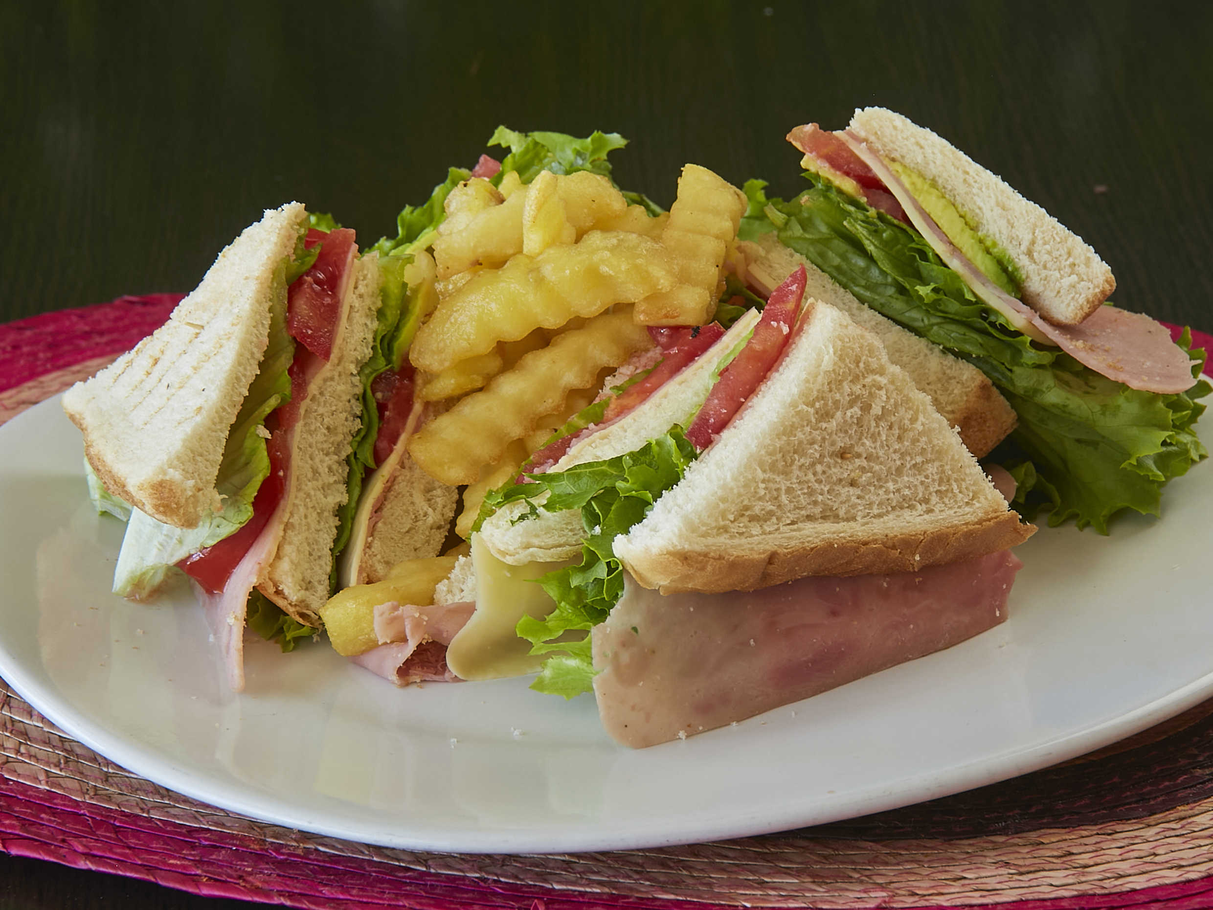 3 Rebanadas de pan, jamón, queso manchego, lechuga, jitomate, aguacate, cebolla, salchicha y aderezo de tocino con pollo; acompañado de papas a la francesa.
