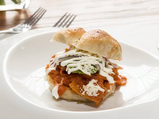 Torta de Chilaquiles con Milanesa, salsa a tu elección, cebolla, queso, crema, y proteína a elegir.