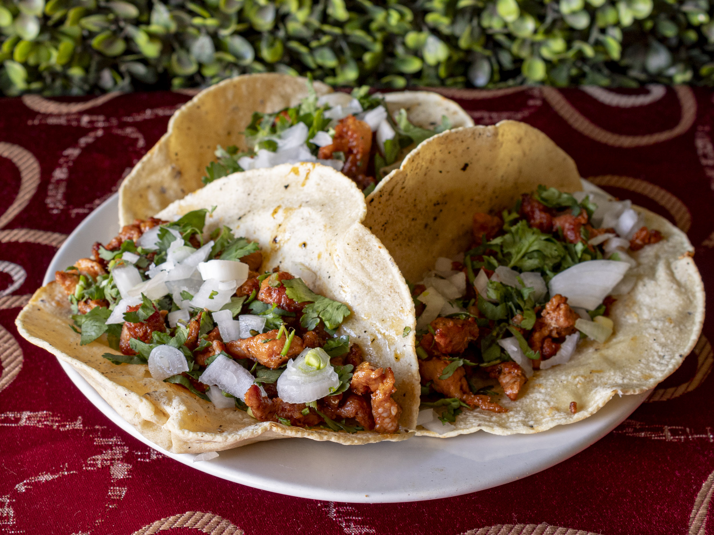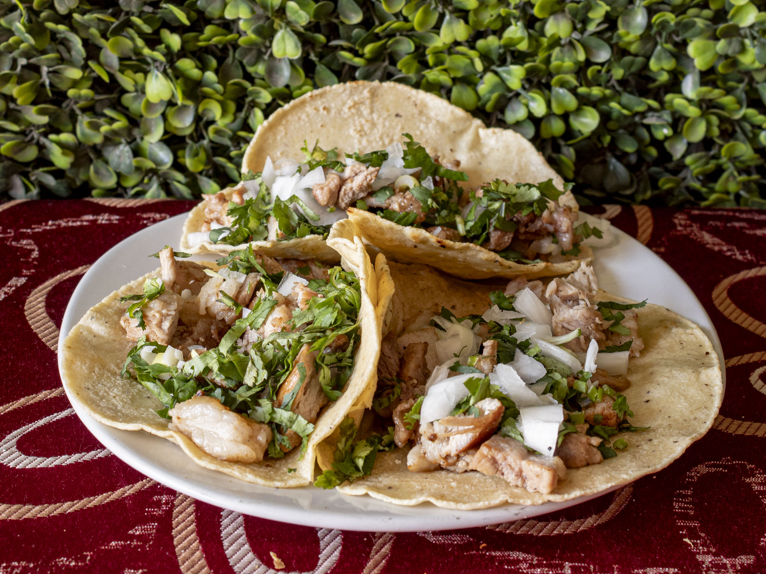 3 Tacos en Tortilla de maíz, bistec asado, cebolla, cilantro y salsa.