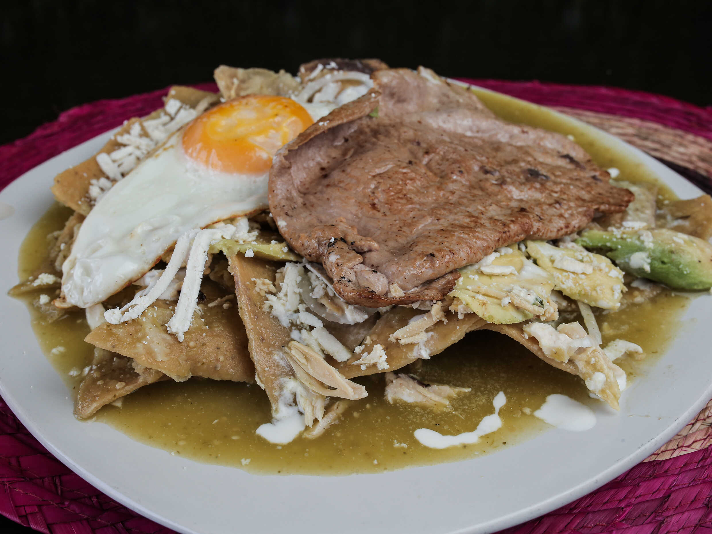 Chilaquiles con Pollo, Huevo y Bisteck