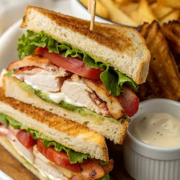 3 panes, mayonesa, lechuga, jitomate, aguacate, pollo deshebrado, tocino, jamon, queso americano y 150 gr de papas a la francesa