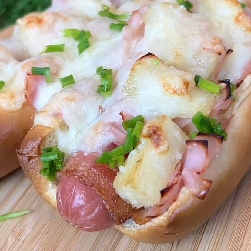 Pan Medianoche,salchicha, piña, jamon, queso gratinado