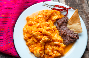 2 Piezas. De huevo revuelto con chilaquiles ahogados en salsa verde o roja con queso, crema, cebolla y frijoles.