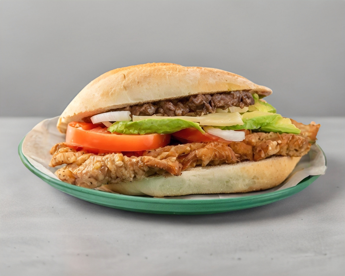 Pechuga adobada, aguacate, cebolla, mayonesa y acompañado de papas a la francesa.