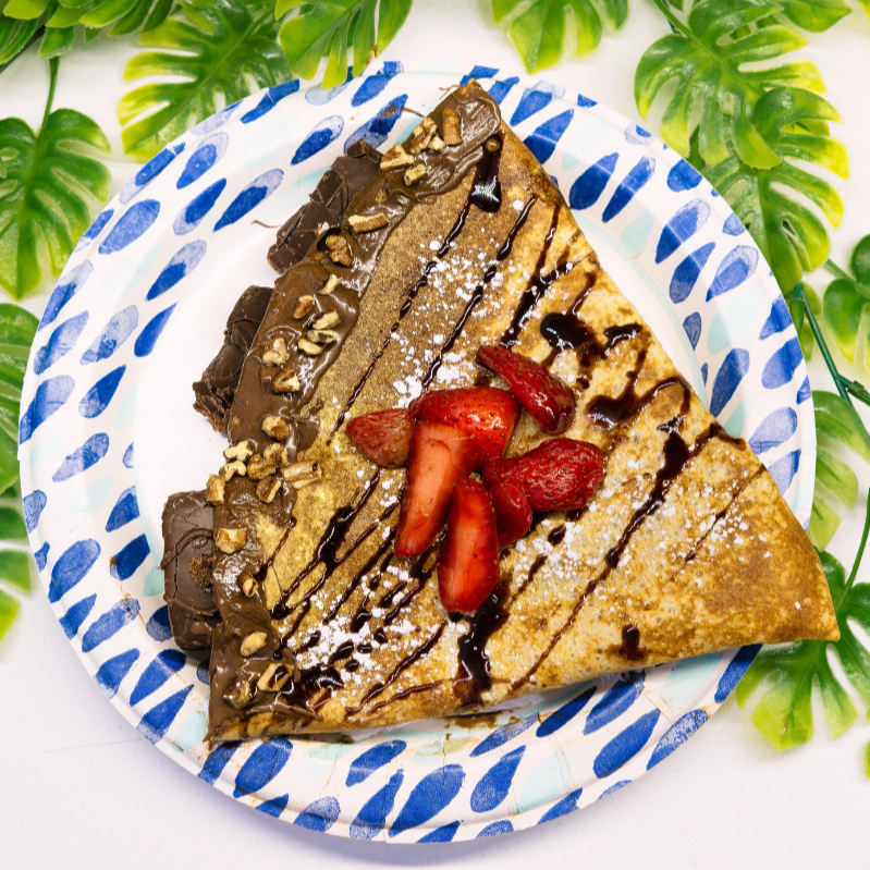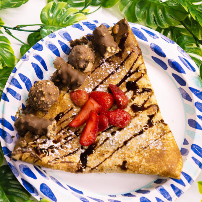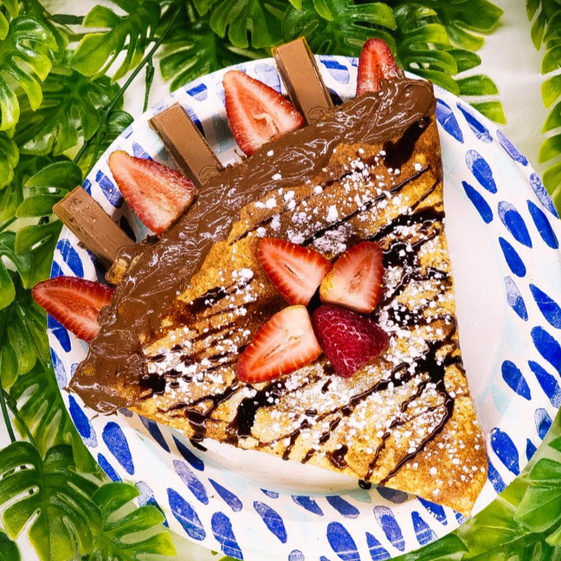 El irresistible sabor de KitKat en una crepa, con fresas y deliciosa fresa recien cortada, nutella y philadelphia, adicionada con el jarabe de tu eleccion y más fresas encima