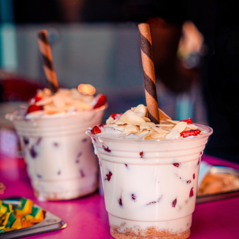 Las fresas con crema mas deliciosas con la receta original de la casa, crema batida, un jarabe a elegir y dos toppings de tu preferencia servidas en un vaso de 10oz