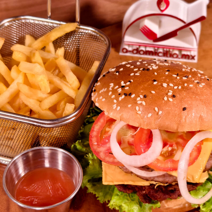 Hamburguesa con 120gr de carne, tiras de tocino, queso cheddar, lechuga, jitomate y cebolla.