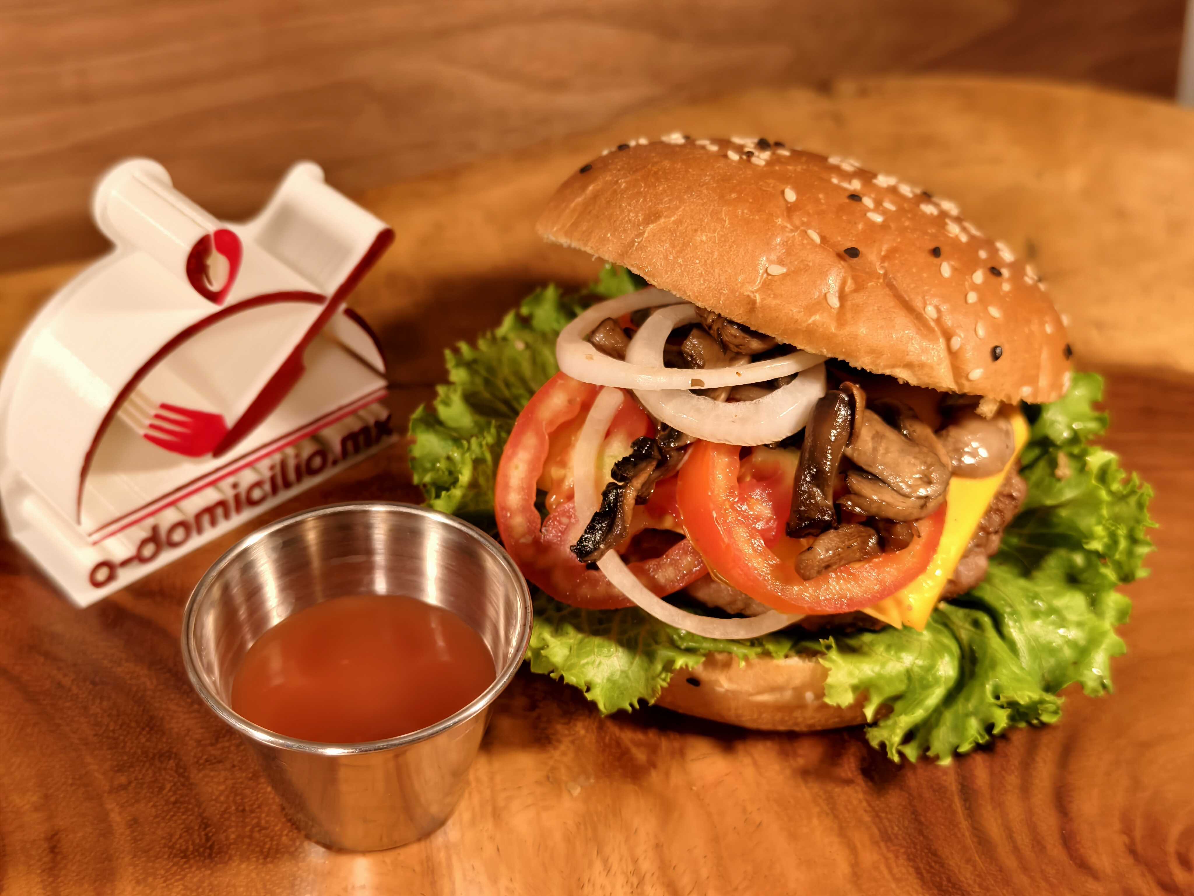 Hamburguesa con una carne de 90-110g, Queso Mozarella, Champiñones salteados en Mantequilla y Cebolla Caramelizada