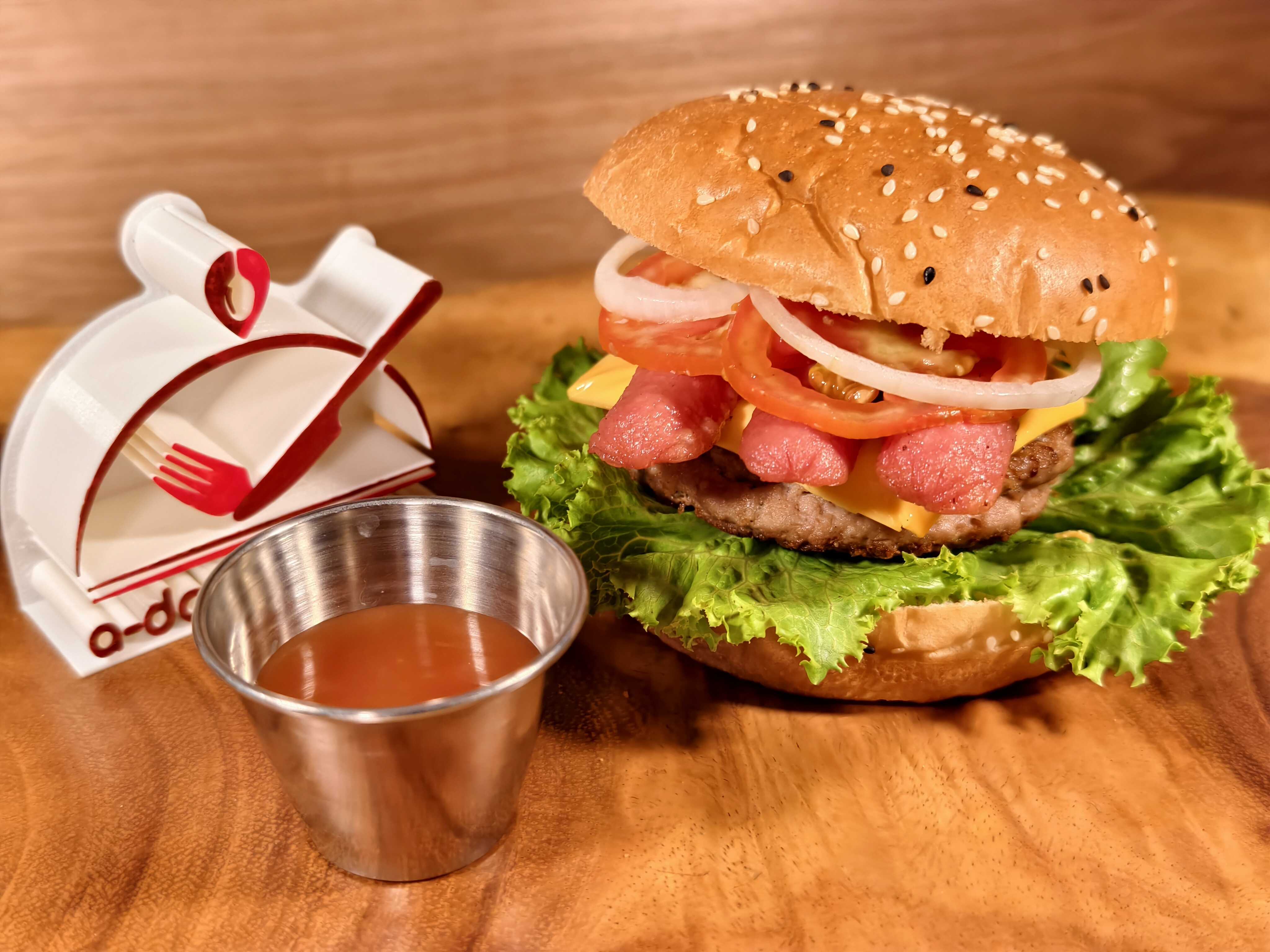 Hamburguesa con una carne de 90-110g, Queso Americano, Salchicha y salsas