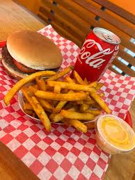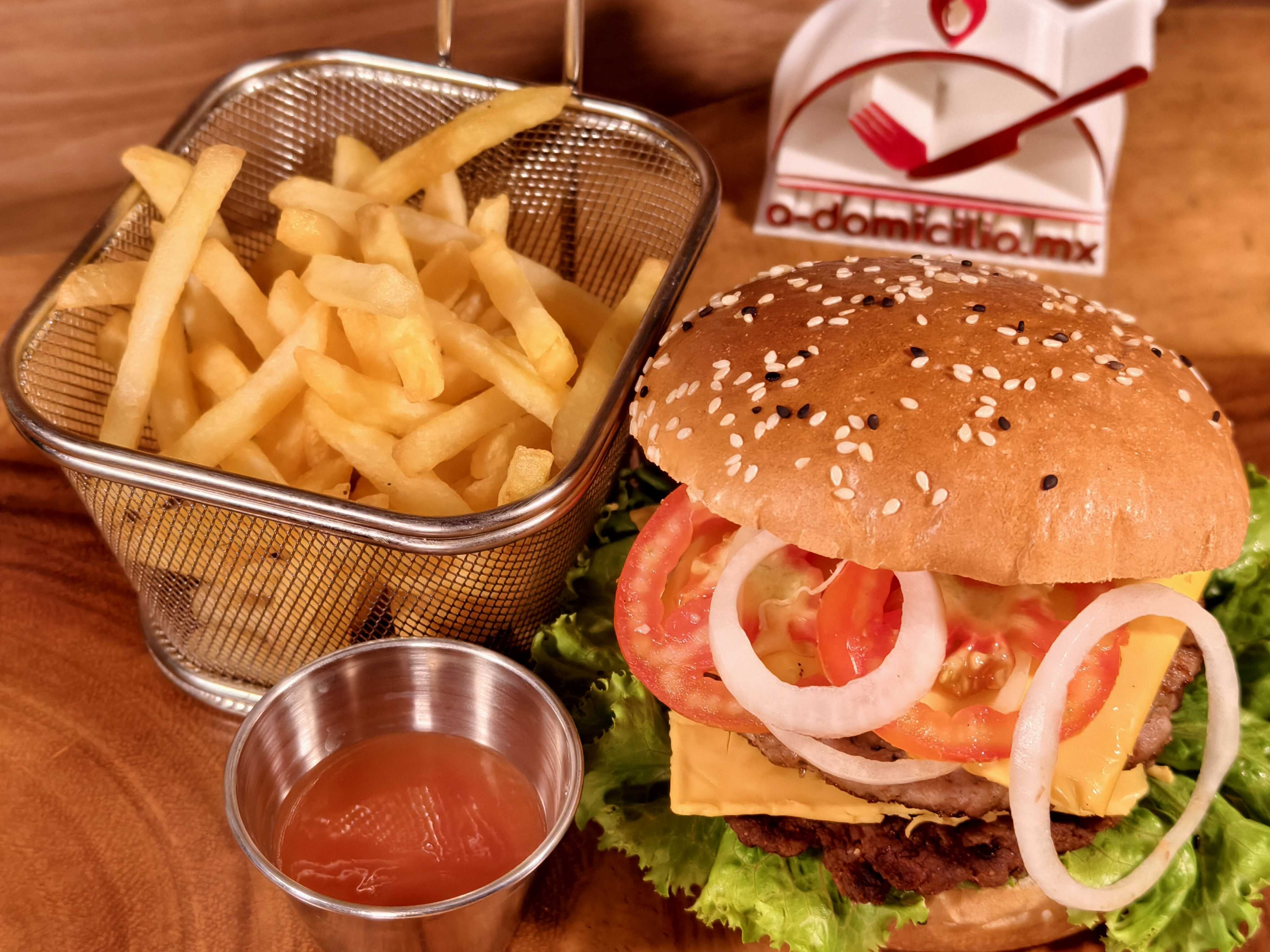 Hamburguesa con una carne de 90-110g, Queso Americano, Vegetales y Salsas + Papas a la francesa + Bebida