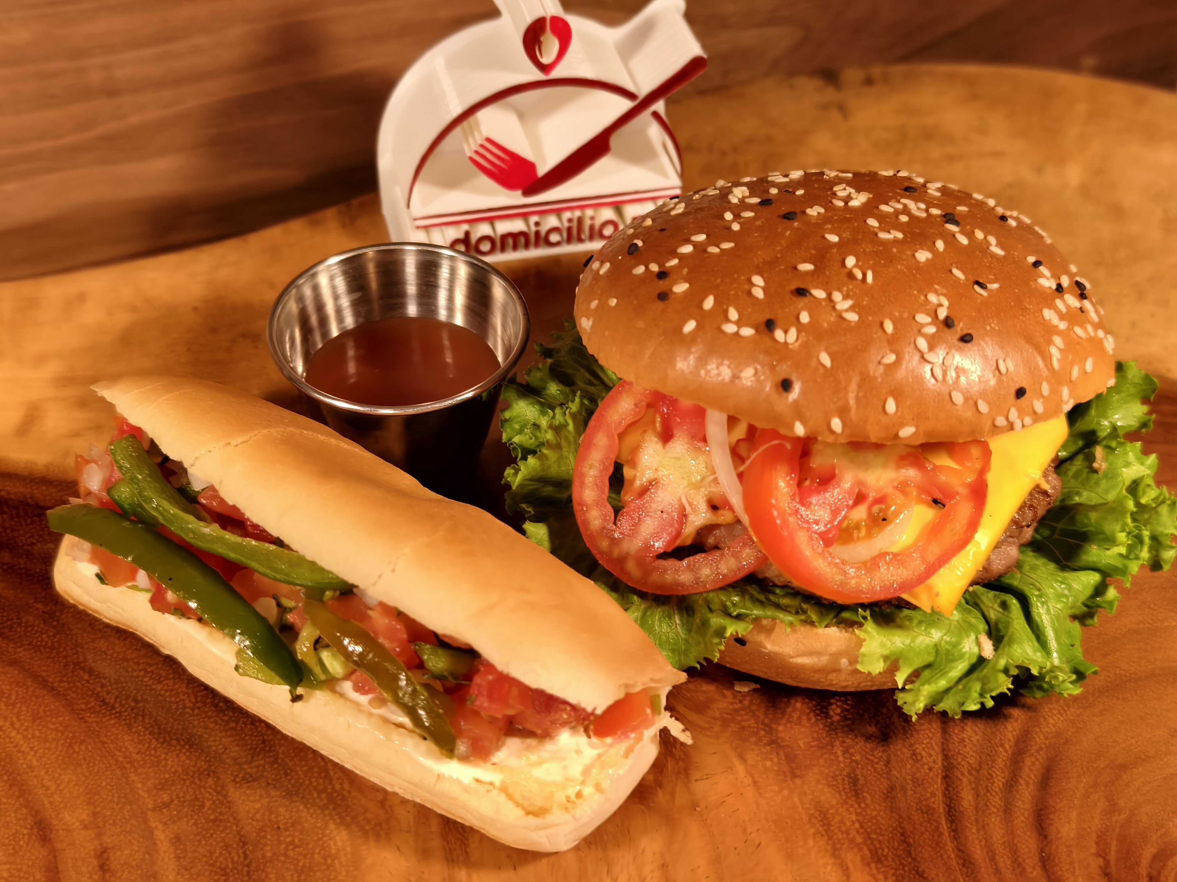 Hamburguesa con una carne de 90-110g, Queso Americano, Vegetales y Salsas + Hot Dog Clasico