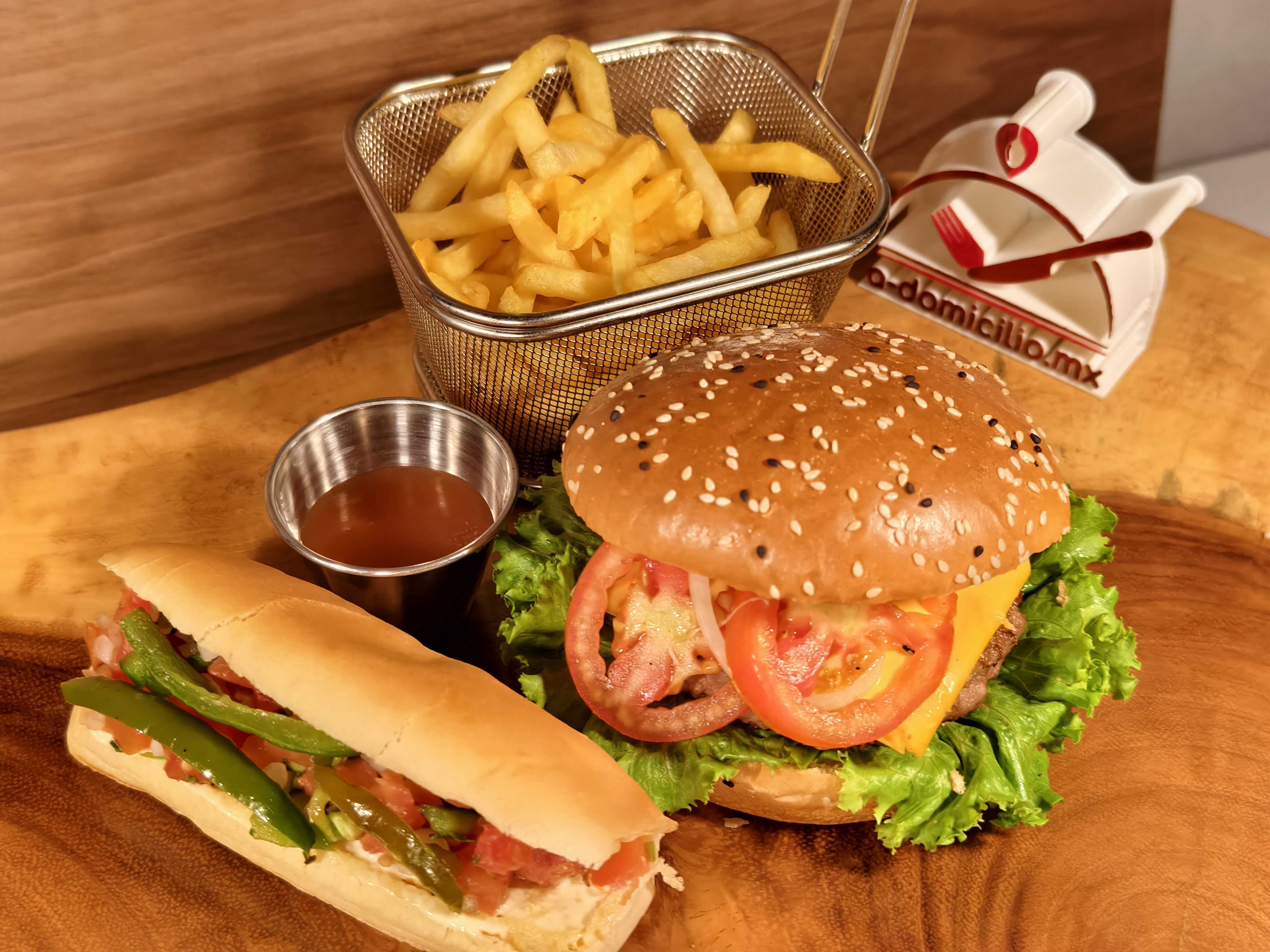 Hamburguesa con una carne de 90-110g, Queso Americano, Vegetales y Salsas + Hot Dog Clasico + Papas a la francesa