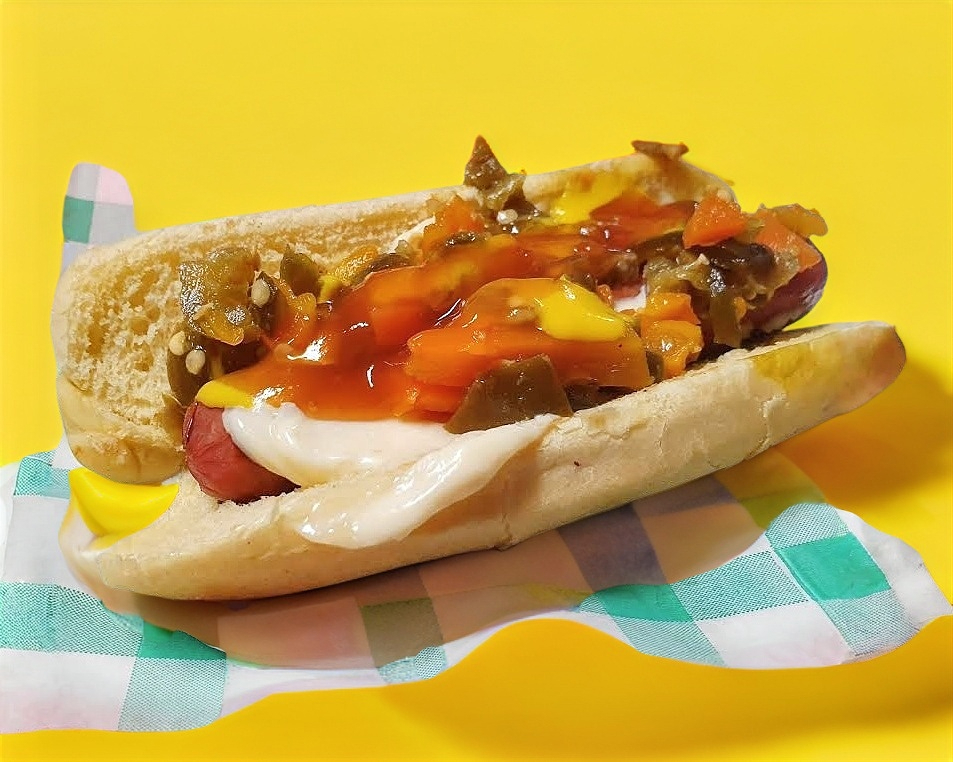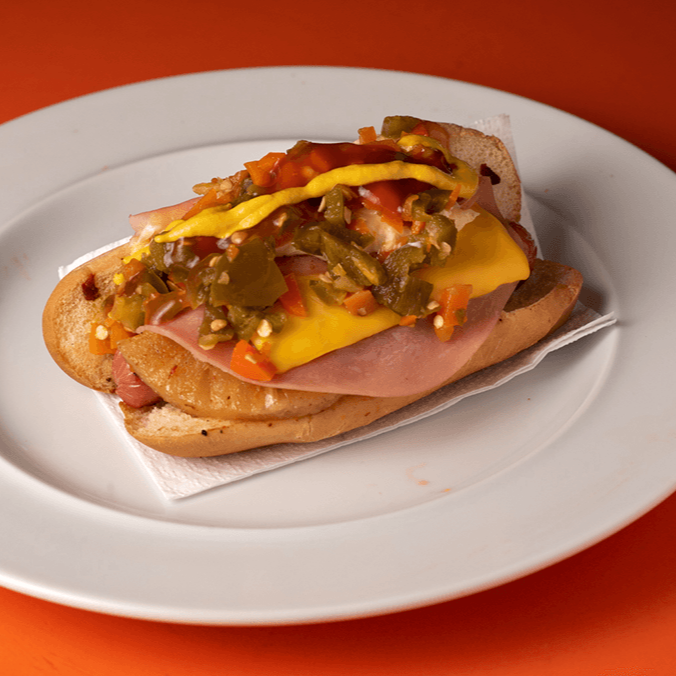 Salchicha, piña, jamón, queso amarillo, mayonesa, cátsup, mostaza y zanahoria con jalapeños.