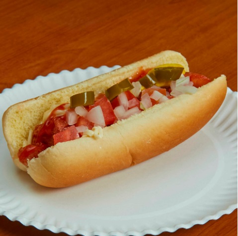 Salchicha, chorizo, quesillo, cebolla, jitomate, tocino, doritos, aguacate, lechuga, mayonesa, cátsup, mostaza y zanahoria con jalapeños.