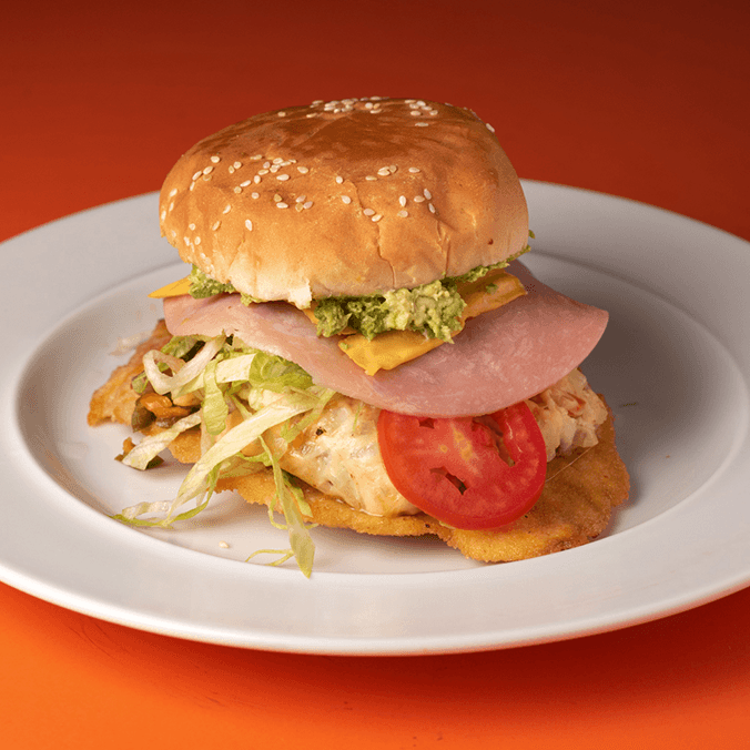 Hamburguesa de pollo empanizado, quesillo, champiñones, cebolla, aguacate, jamón, queso amarillo, lechuga, jitomate, mayonesa, cátsup, mostaza y zanahoria con jalapeños.