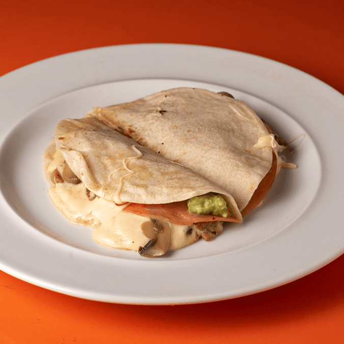 Dos tortillas de harina, quesillo, champiñones, cebolla, aguacate y jamón.