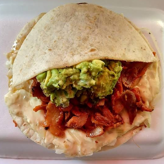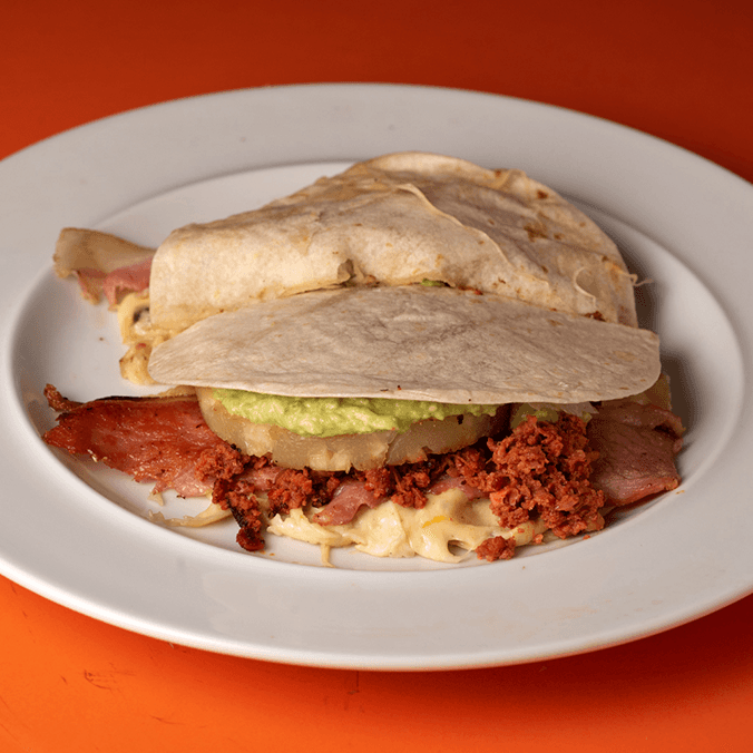 Dos tortillas de harina, quesillo, cebolla, chorizo, aguacate, frijoles, piña y tocino.