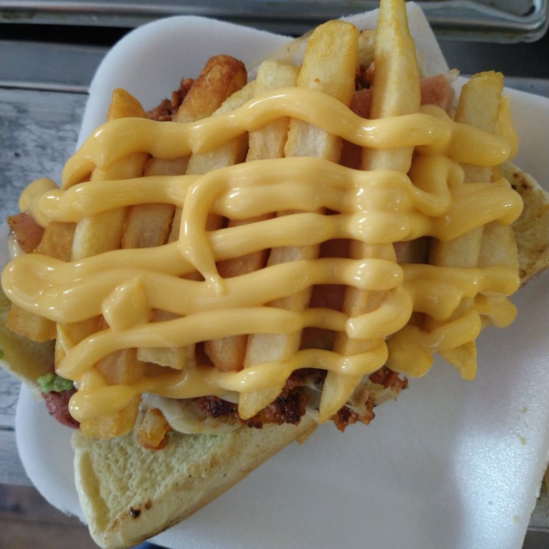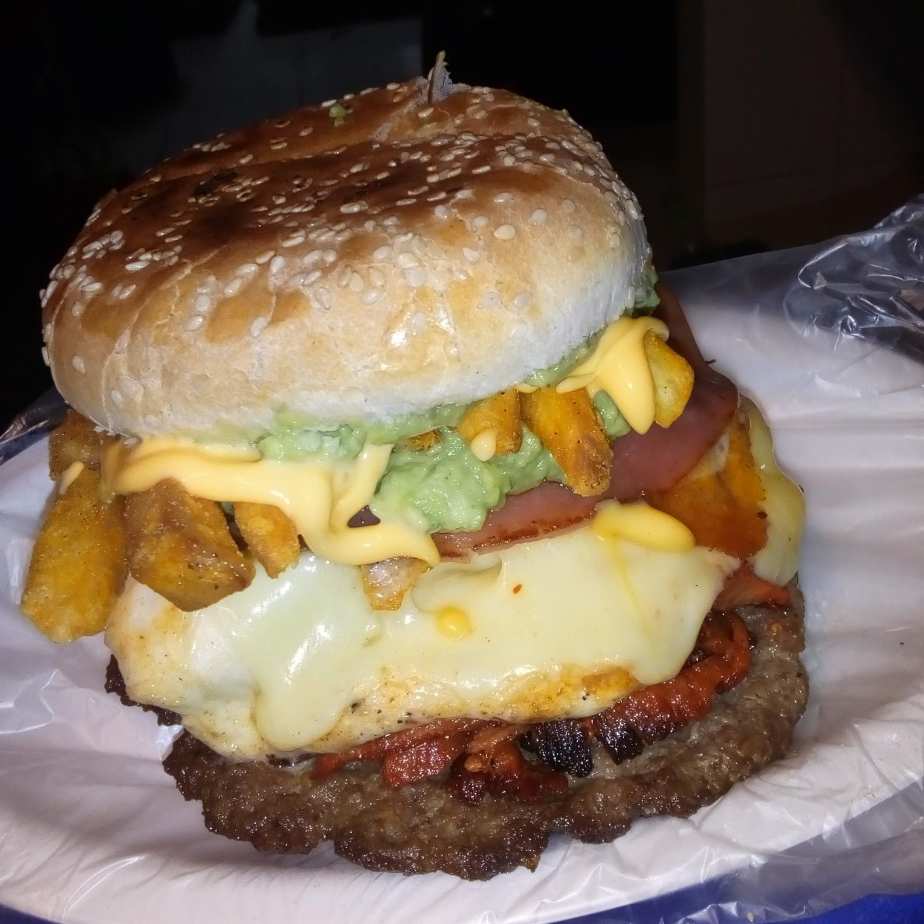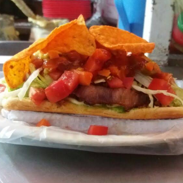 Hamburguesa con carne de res, queso, manchego, queso, derretido, quesillo, cebolla, salchicha, aguacate, chorizo, papas, mayonesa, cátsup, mostaza y zanahoria con jalapeños.