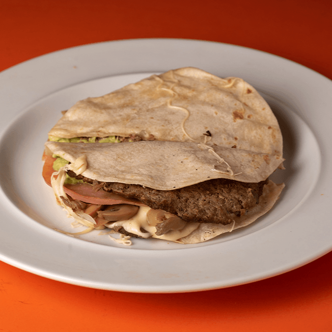 Carne de hamburguesa, dos tortillas de harina, quesillo, champiñones, cebolla, aguacate y jamón.