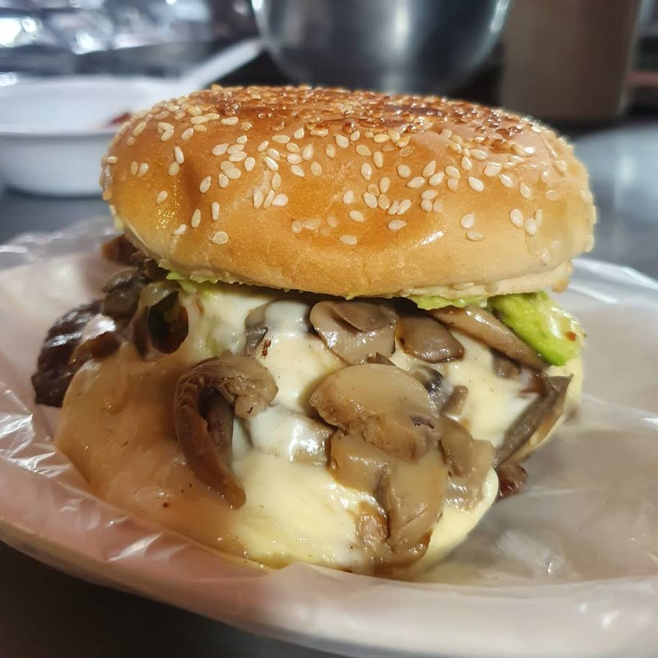 Hamburguesa con carne de res manchego, champiñones, aguacate, mayonesa, cátsup, mostaza y zanahoria con jalapeños.
