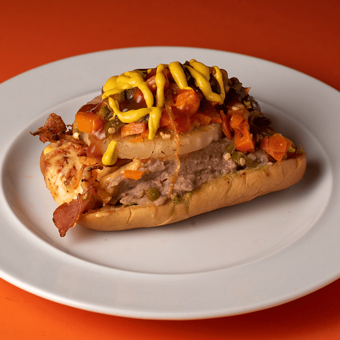 Salchicha, chorizo, quesillo, cebolla, tocino, piña, aguacate, frijoles, mayonesa, cátsup, mostaza y zanahoria con jalapeños.