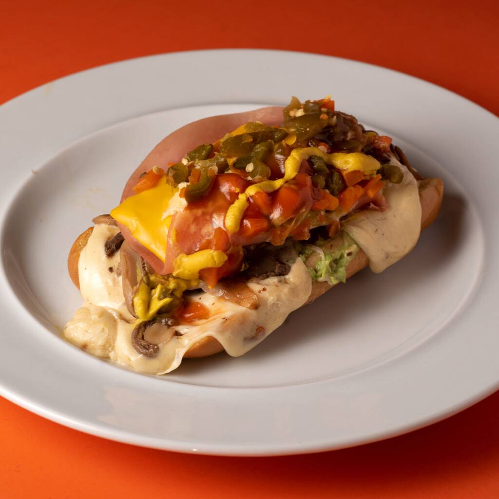 Carne de res de hamburguesa, queso manchego, salchicha, aguacate, jamón, mayonesa, cátsup, mostaza y zanahoria con jalapeños.