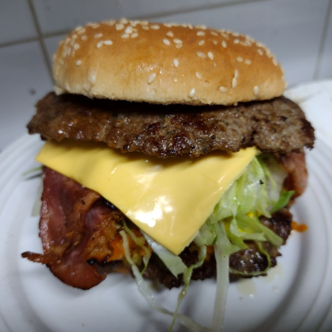 Hamburguesa doble carne de res de hamburguesa, queso, amarillo, tocino, lechuga, mayonesa, cátsup, mostaza y zanahoria con jalapeños.