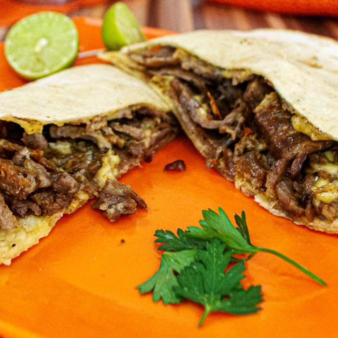 Dos tortillas de harina con carne árabe quesillo y aguacate