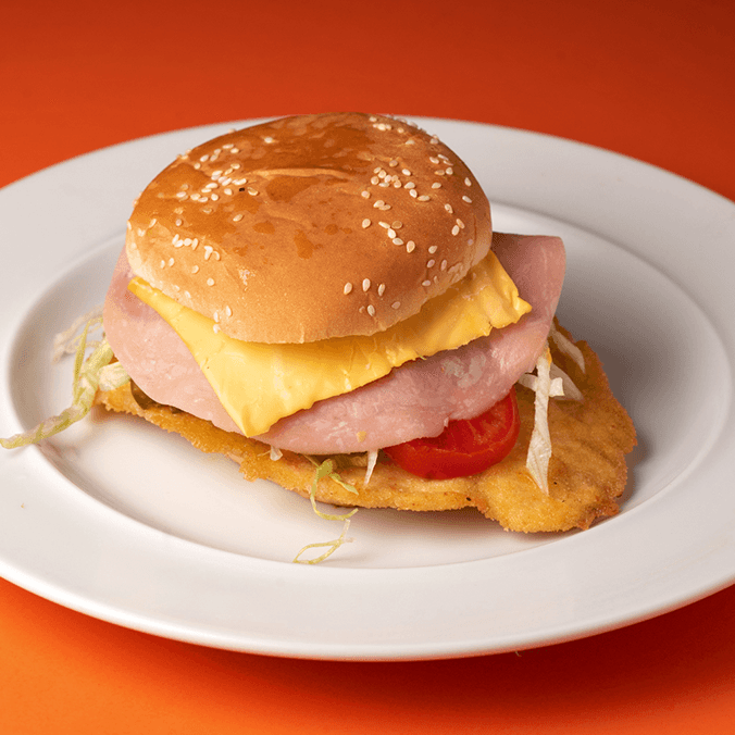 Hamburguesa de pollo empanizado, jamón, queso amarillo, lechuga, jitomate, mayonesa, cátsup, mostaza y zanahoria con jalapeños.