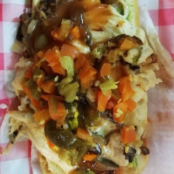 Salchicha, quesillo, champiñones, cebolla, aguacate, mayonesa, cátsup, mostaza y zanahoria con jalapeños.