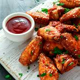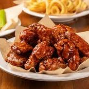4 alitas de pollo bañadas en adereza al gusto con 150 grs de papas ala francesa y un aderezo el gusto