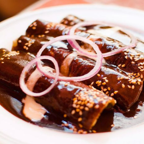 3 deliciosos envueltos de mole, con pollo decebrado o queso encima y cebolla