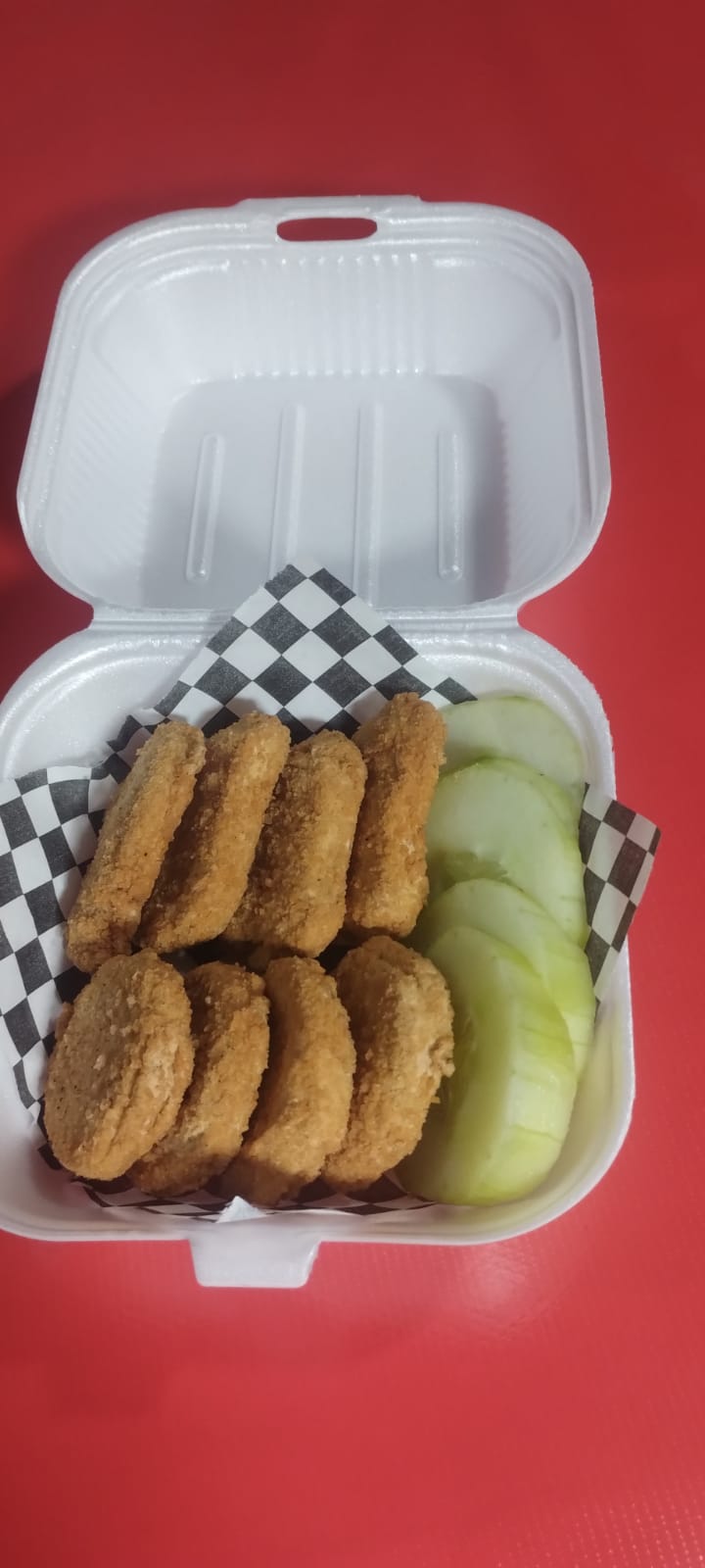 Deliciosas Nuggets de pollo acompañadas de pepinos y los aderezos de tu elección.
