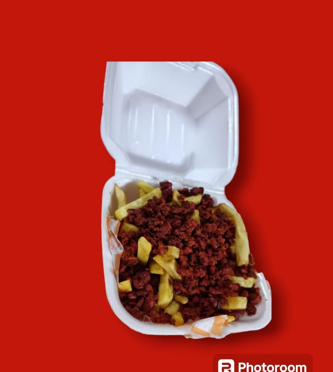 Exquisitas papas tipo francesas con chorizo y trozos de tocino con cheso chédar.