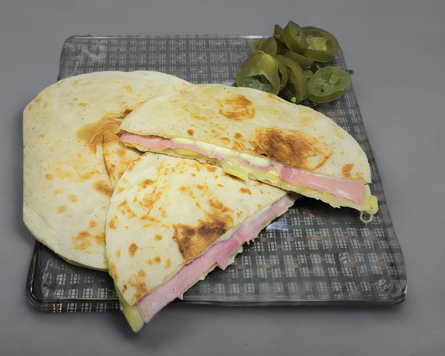 Descubre el placer de 2 tortillas de harina tipo gringa, rellenas de jamón, queso manchego, queso americano, quesillo, jamón y el toque picante que elijas