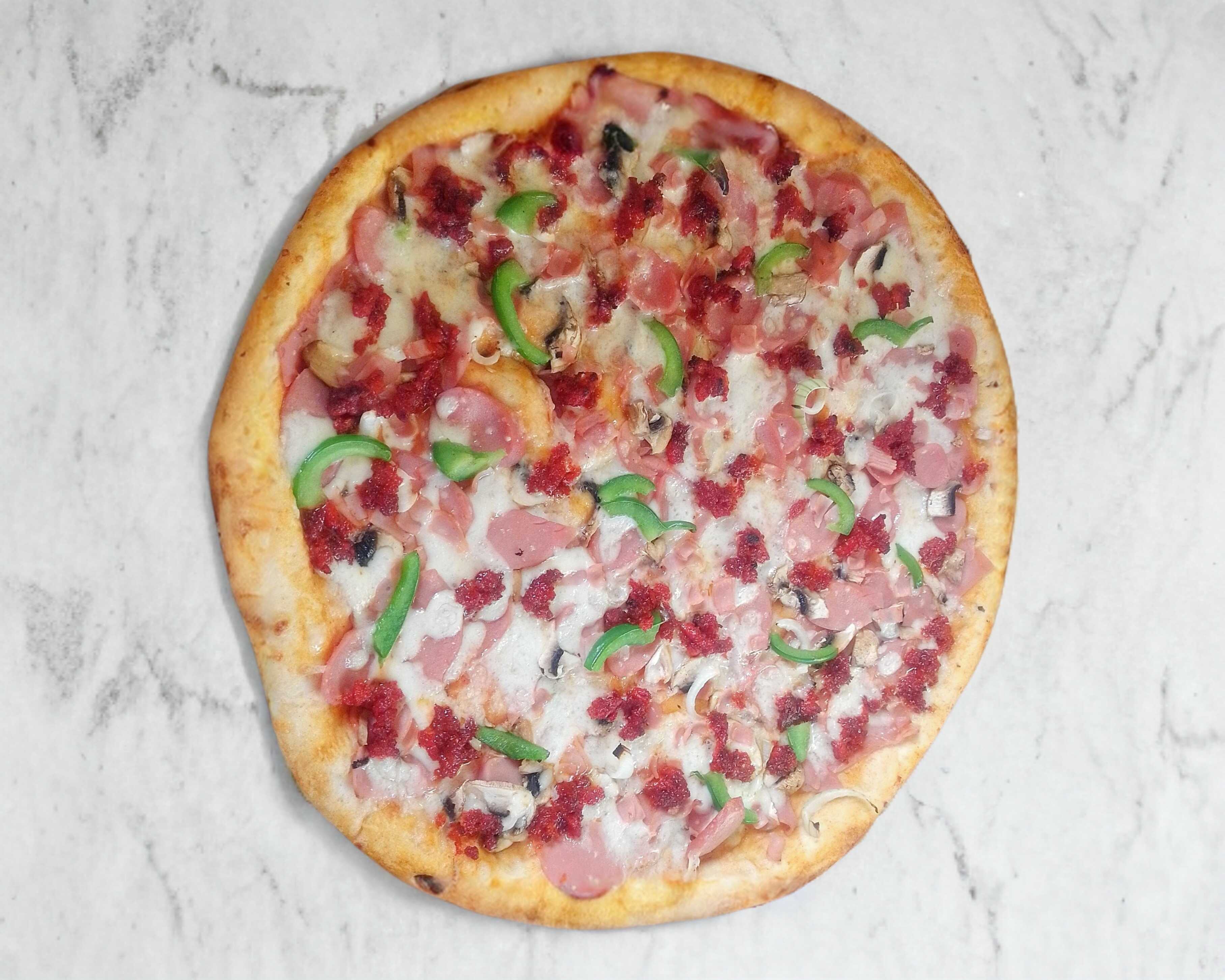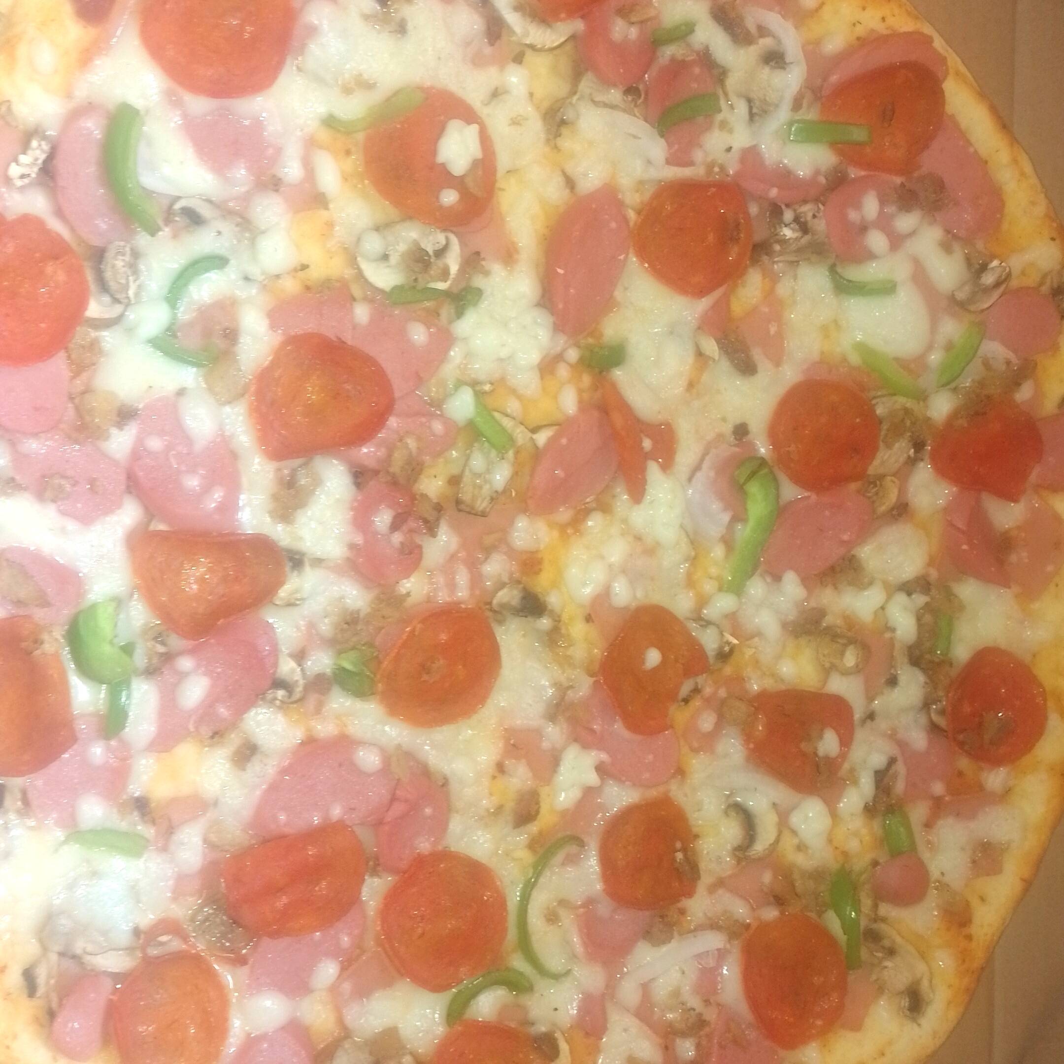 Jamón, salchicha, champiñón, pepperoni, carne molida, pimiento y cebolla.
